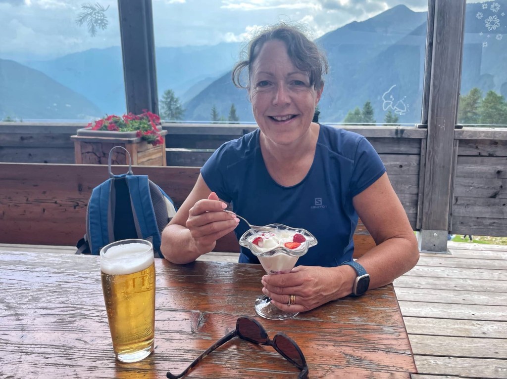 By this time, one of my knees was hurting from the constant and often steep and rocky descent… over 1000 metres in 8 kilometres. Therefore, I was happy to reach Rifugio Scoiattolo, where we had a beer and a pudding before taking the gondola down to Peio Fonti. As we arrived back in the town, it started raining. We’d timed the walk perfectly!