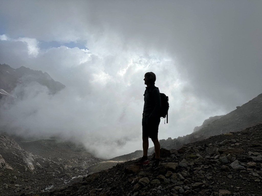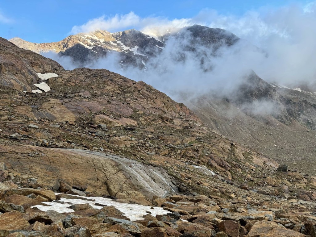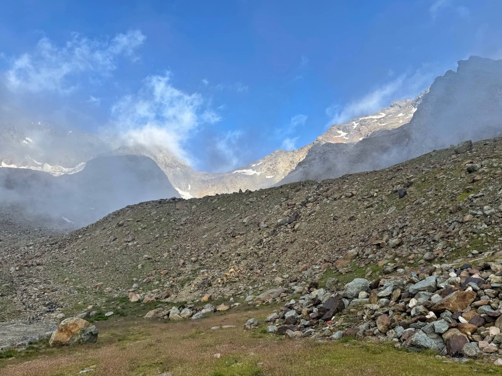 As we left the Peio 3000 lift station, we could see the mountains poking through the clouds ahead of us. I love it when the cloud’s swirling around giving tantalising glimpses of what’s behind it.