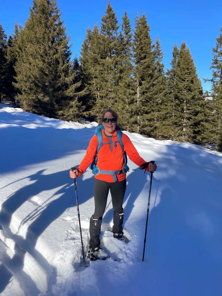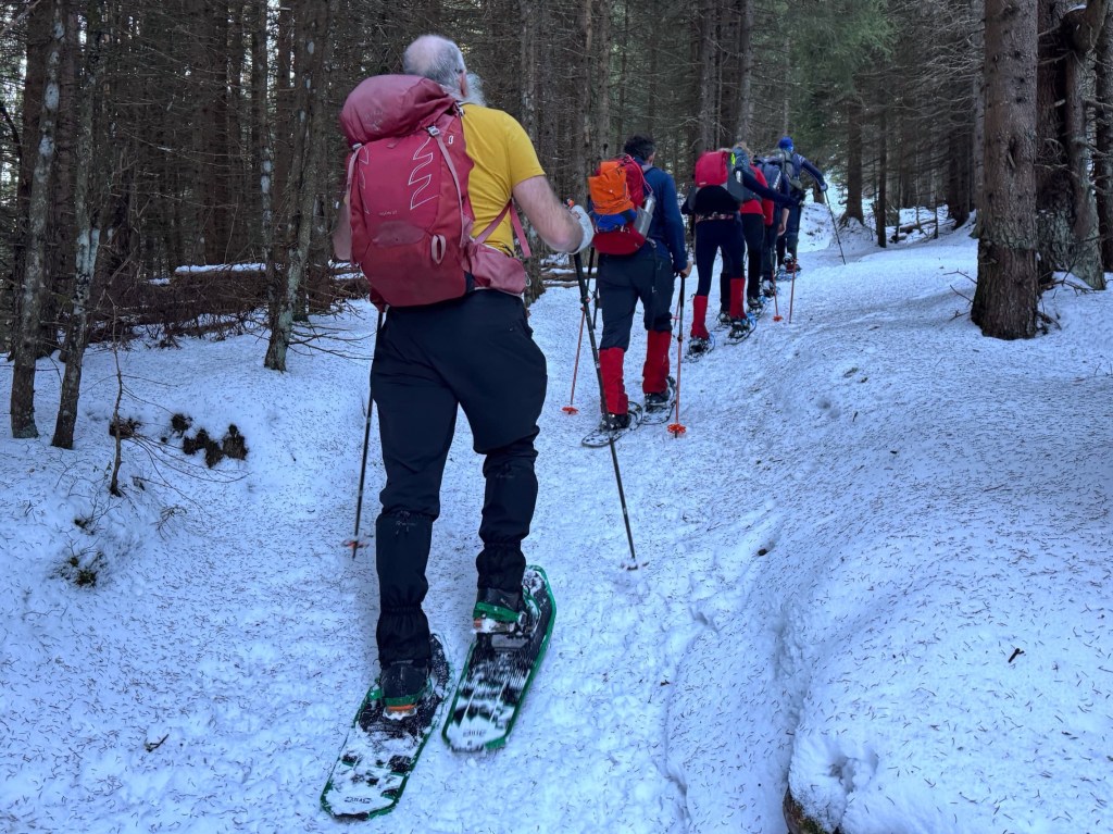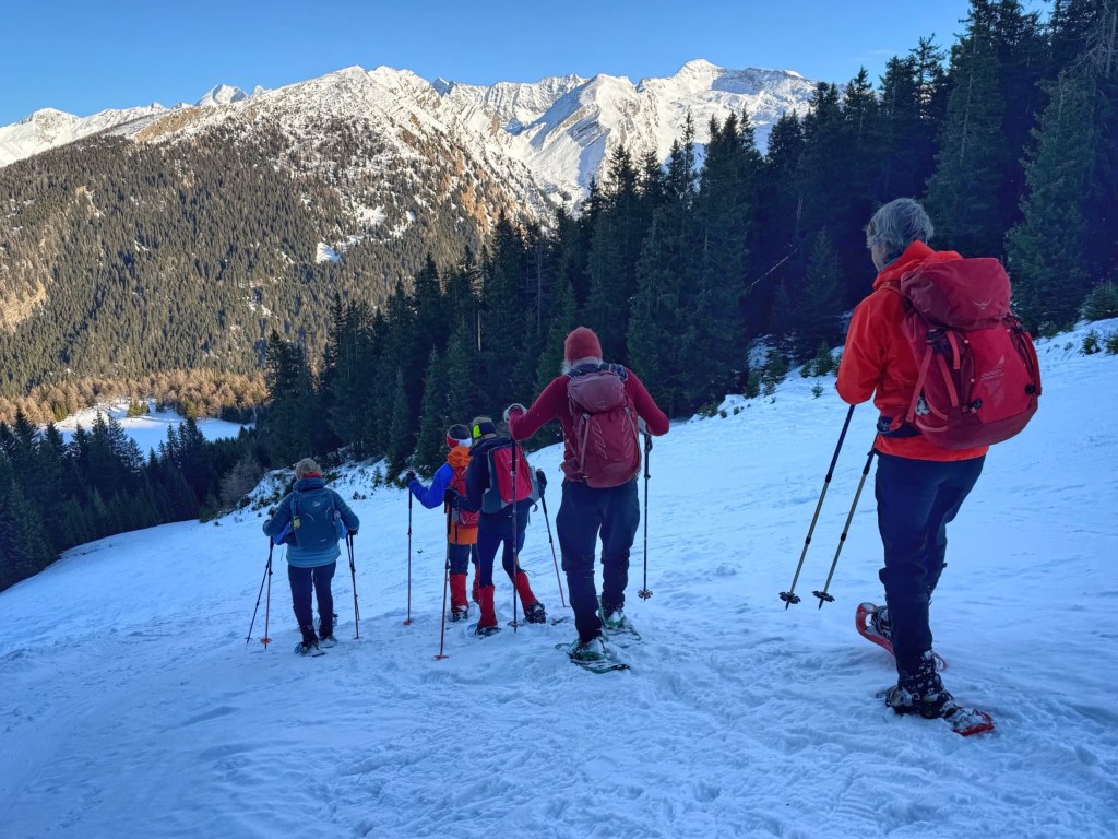 Almi’s took us by minibus down the valley… our group first, then Sean’s. After putting our snowshoes on, we set off up a very steep slope across a field. Lesley must have read my mind and reassured us that it wouldn’t be like that all day! We could see the main road high on stilts across the valley as we climbed, heading to the Brenner pass between Austria and Italy. It sounded very noisy after the silence in the snowy valley… a reminder that, for most people, life was continuing as normal, while we’re in our snowshoeing bubble.