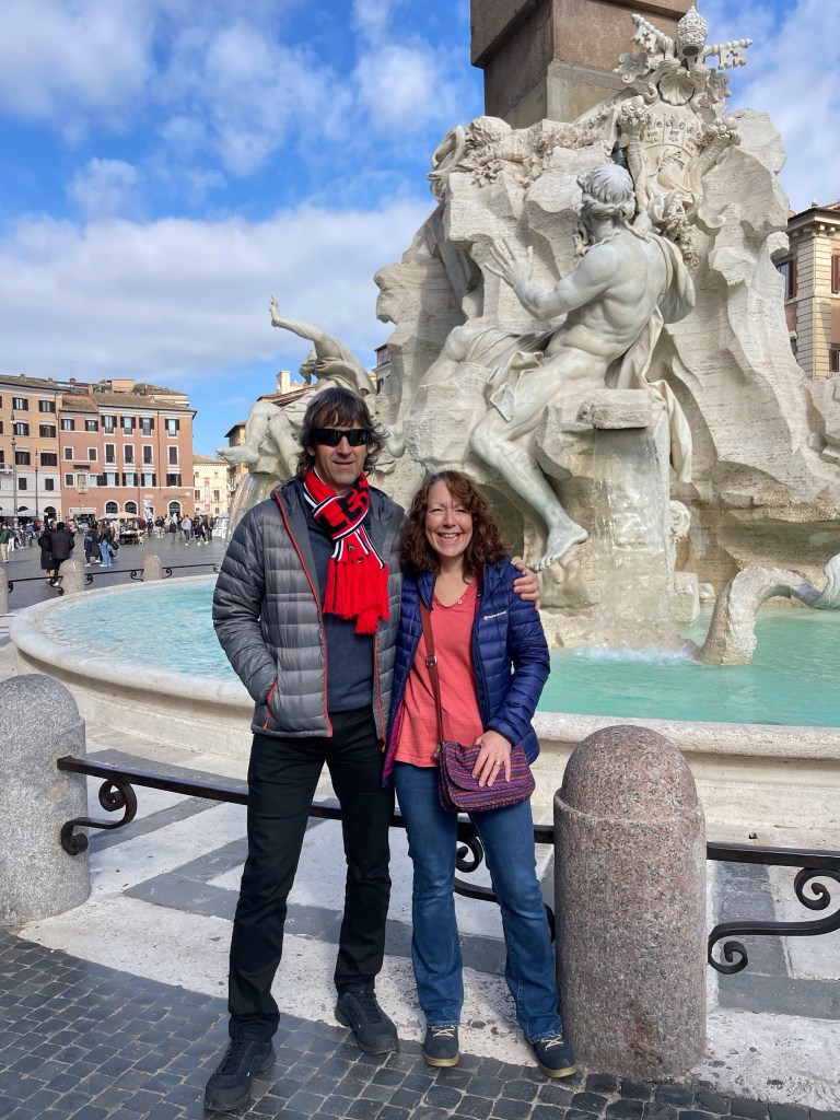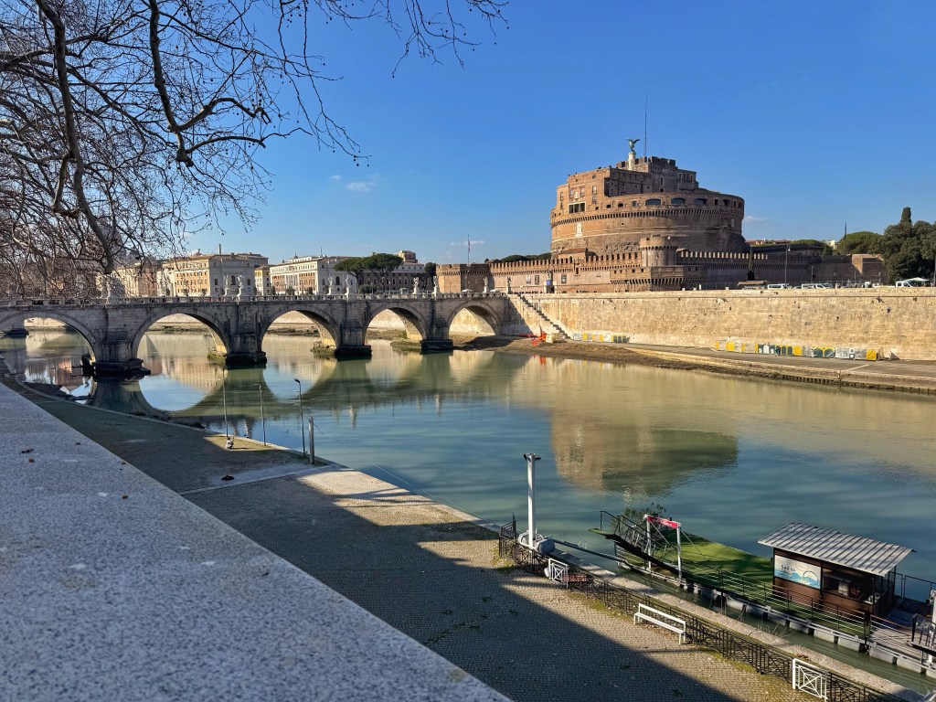 Our first stop was by the River Tiber, where I took photos of the bridges and Castel Sant’Angelo, before heading to Piazza Navone to see the fountains. We then wandered the small cobbled backstreets for a while before stopping to sit in the sunshine and share some pizza and bruschetta for lunch.