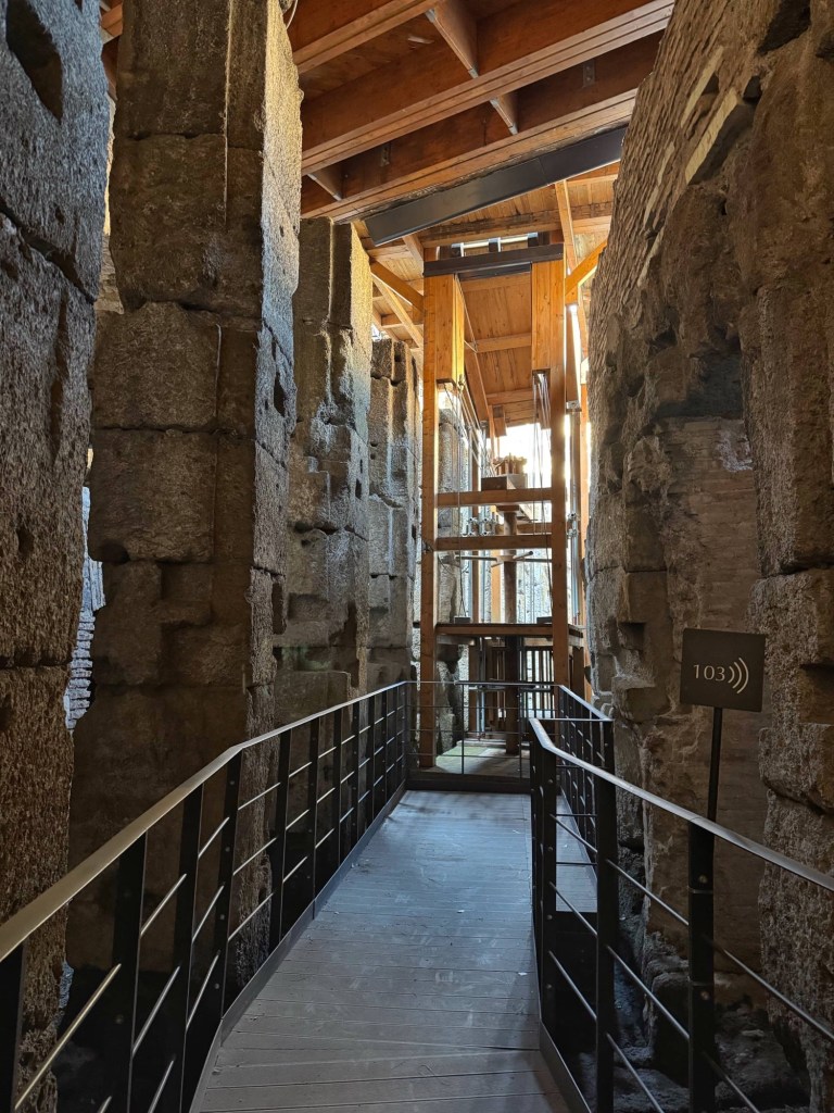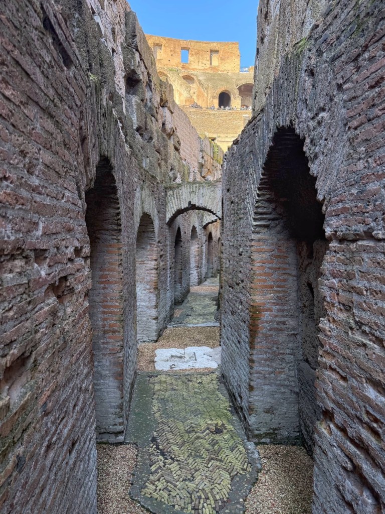 Next we went up to terraces. The 80,000 spectators would have entered through 76 numbered arches around the amphitheatre. Seats were assigned in a strict hierarchical order, with slaves right at the top and the senators closest to the arena. The emperor had an imperial balcony, from when he could choose, influenced by the shouts and cheers of the crowd, whether a gladiator should live or die. Although we have been led to believe otherwise in films, most were allowed to live… after all, it was expensive and time consuming to train new gladiators, and the emperor wouldn’t want to upset the crowd by killing their favourites!