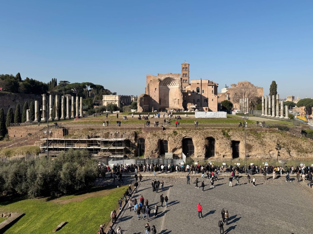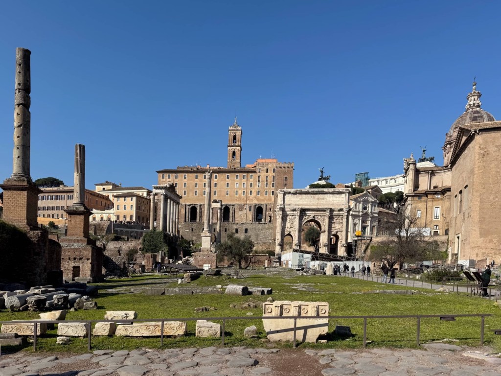 Higher up the terraces, we enjoyed the view of the triumphal arch, the Forum and the city beyond. The Roman Forum is full of buildings (many now in ruins) that were built over centuries for political, religious and commercial activities. Monuments were added by various emperors. It’s been a lovely day and we enjoyed wandering through the ruins, although we both said we’d had enough of old lumps of rock by the end of the tour!