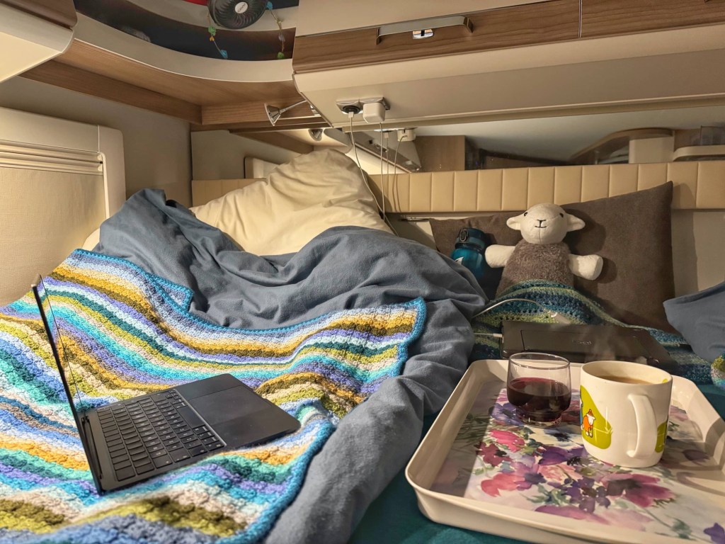 After a hot shower, I ate curry and rice, washed up, then headed to bed with my wine to watch the last two episodes of my series. I’ve enjoyed time to myself, in one place, but I’m looking forward to John getting back, and to moving on to visit somewhere new. 😃
