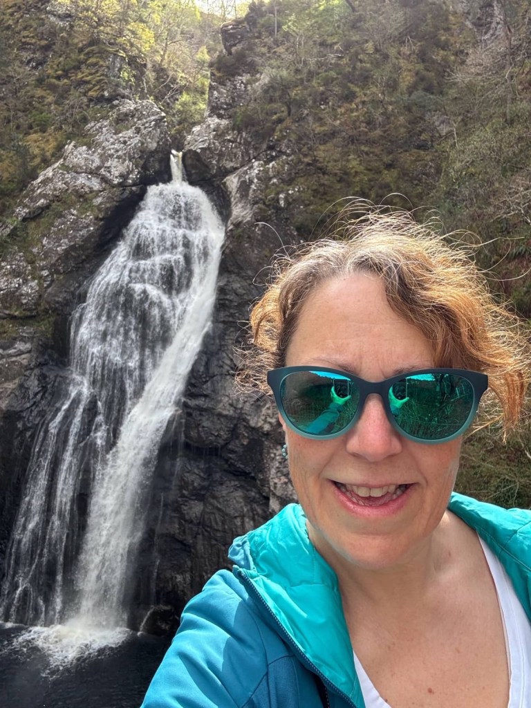 Then, the lady in the motorhome next door came over. She’d seen my swimming kit on the washing line and asked me if I’d been swimming in Loch Ness. Like me, she’d read online that it’s not recommended because it’s so cold… only 9 degrees this week! She was desperate to give it a go so I lent her my wetsuit jacket and John’s neoprene gloves and socks, and off we went. She loved it and, as we chatted away, we ended up swimming for about 18 minutes, despite the cold wind and water!