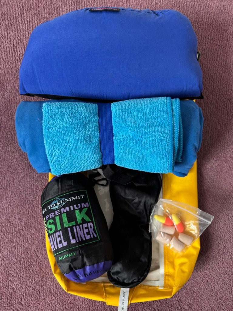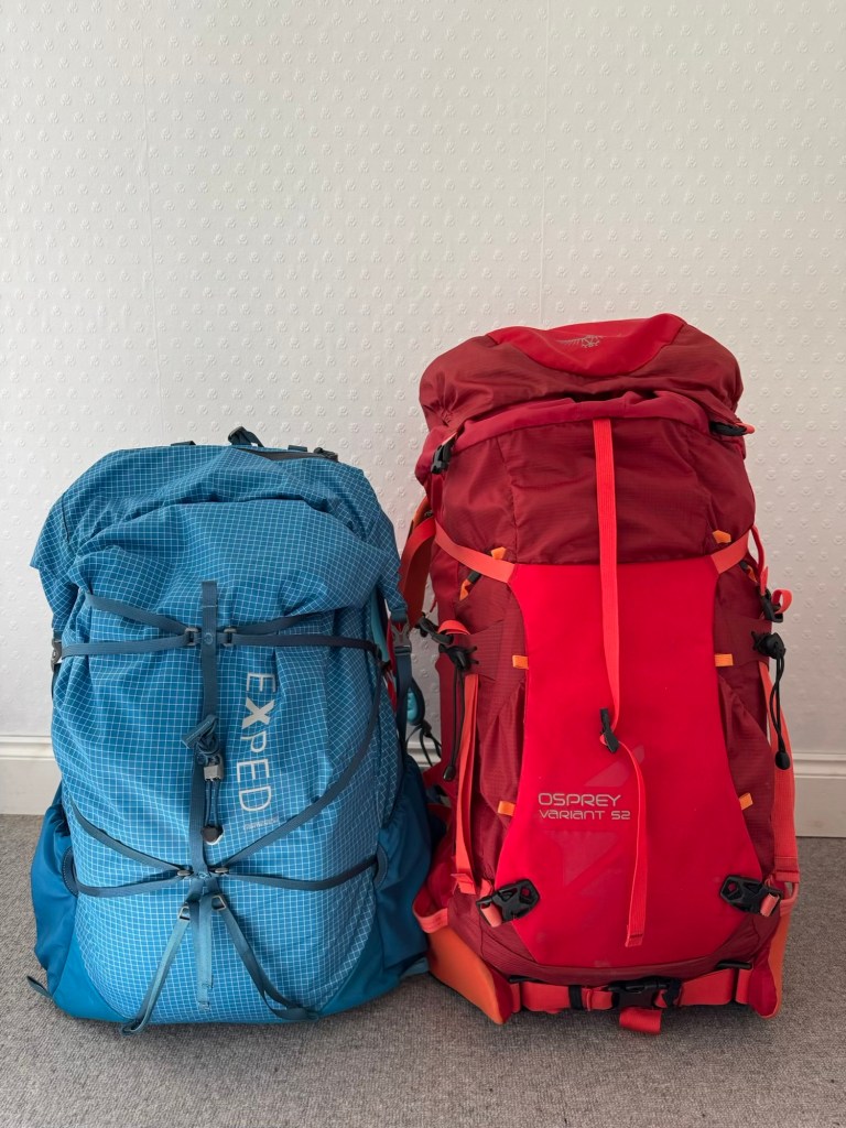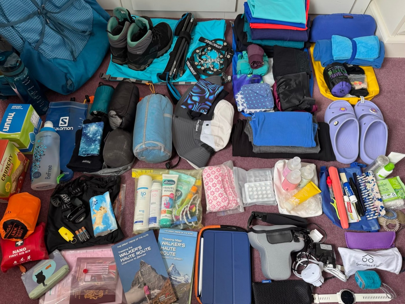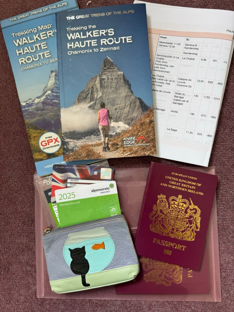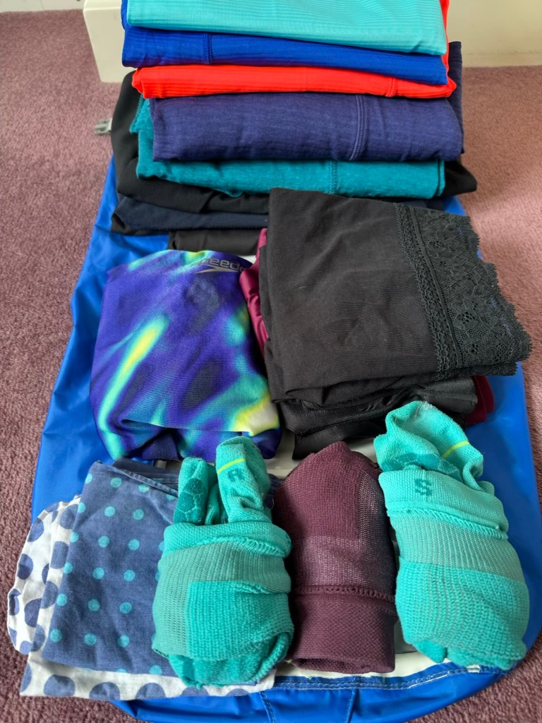 Today, I’ve been through my kit for the trek, managing to reduce what was quite a large pile down to 8.5 kilograms, including my rucksack…. who needs a 23 kilogram luggage allowance?! My pack still feels very heavy to be carrying up and down mountains for 3 weeks though! Our guidebook suggests you can do treks like the Walker’s Haute Route with a base kit of 5-6 kilograms, but we’ve decided we need a few extra items, partly because we have an additional week in an Airbnb in Kandersteg, but also because previous experience has shown us that some things help make our trips more enjoyable or comfortable. Here’s what made the final cut. Hopefully, this blog will make packing faster and easier next time we do a trek!