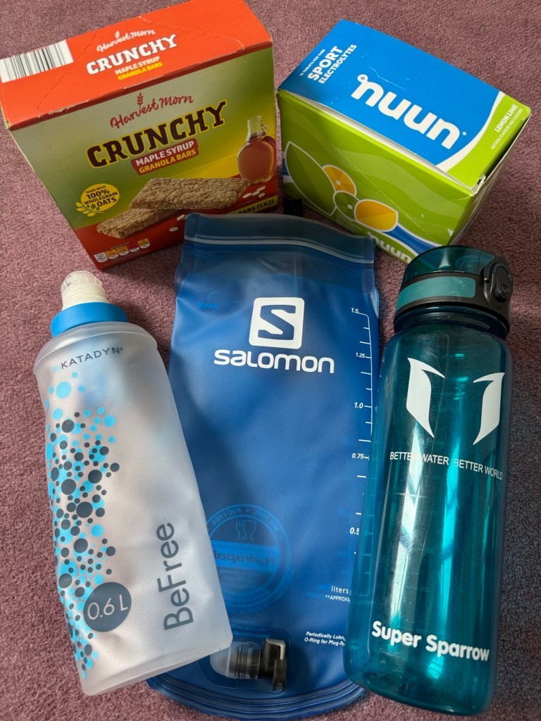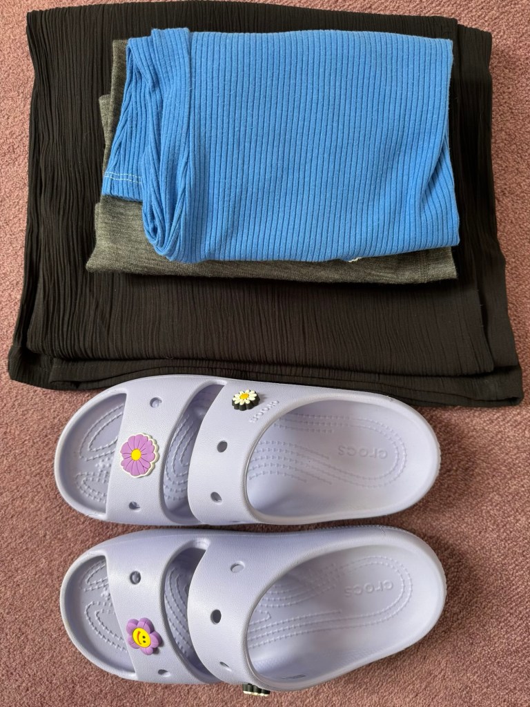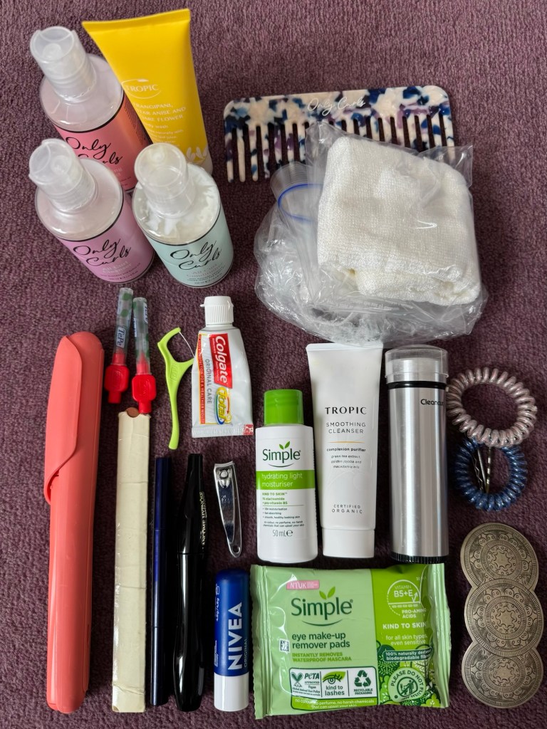 I have 3 sets of hiking clothes… one on, one off and one in the wash… 3 technical T shirts, 2 light long sleeved fleeces, a pair of trousers, 2 skorts, and 3 lots of socks, knickers and crop tops. I also have a set of comfortable clothes for the evening, which will feel smarter if we go out for meal, and a swimming costume. For when it rains or if I’m cold, I have a waterproof smock, a poncho, a down gilet and some light waterproof trousers… Also, a sun hat, a buff that will double up as a warmer hat, and fleece gloves.