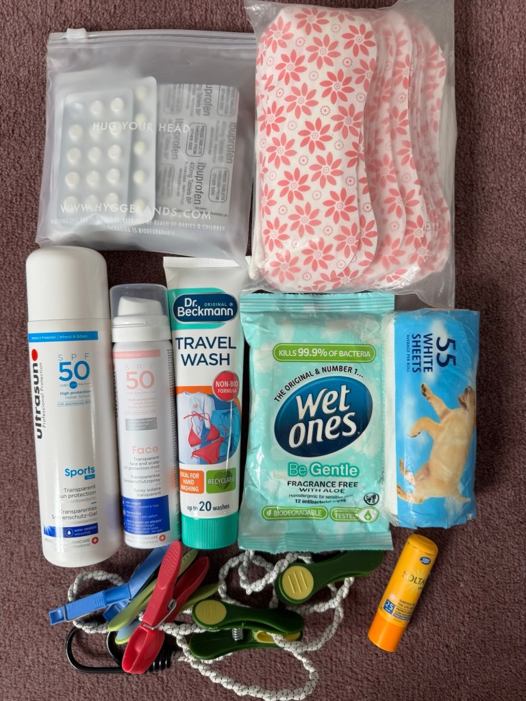 For the mountain refuges, we have silk sleeping bags, small pillows, eye masks, ear plugs and microfibre towels. I’ve tried to reduce my toiletries to the minimum, although my battery powered toothbrush and shaver feel like luxuries! Sun protection is obviously very important, especially at altitude, and I have some basic medication in case we need it… analgesics, antihistamines, loperamide etc. Travel wash and a light clothes line are on our essentials list when we’re trekking for so long.