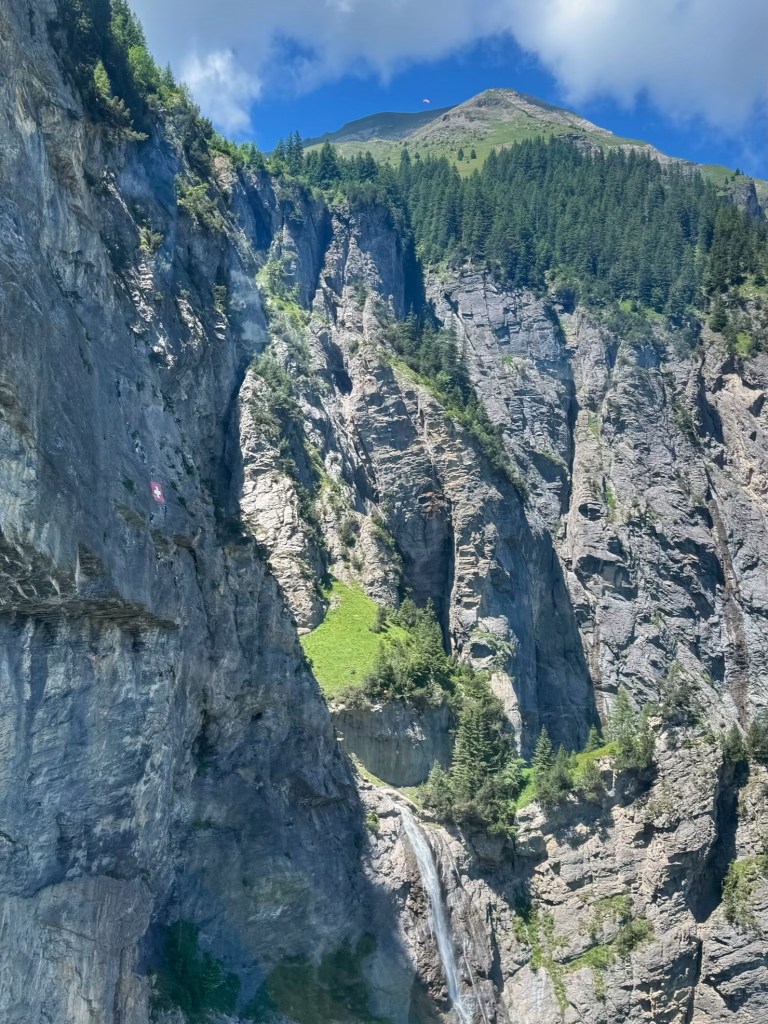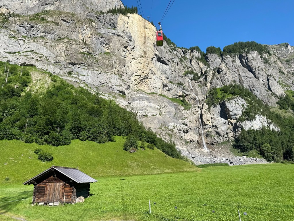 We took the Allmenalp Cable Car from Kandersteg up to 1730 metres, saving ourselves some climbing. The cable car is a tiny little red box, which only takes 8 people, and hugs the rock face as it climbs steeply. We could see people on the via ferrata high on the sheer cliffs above a waterfall… far too scary for us!