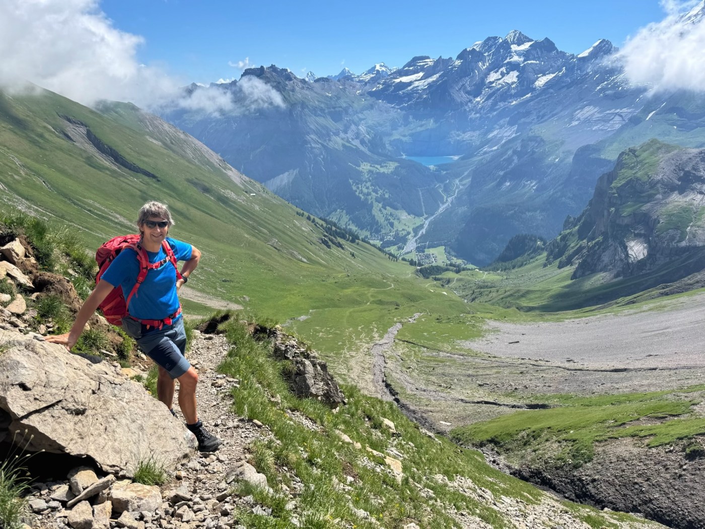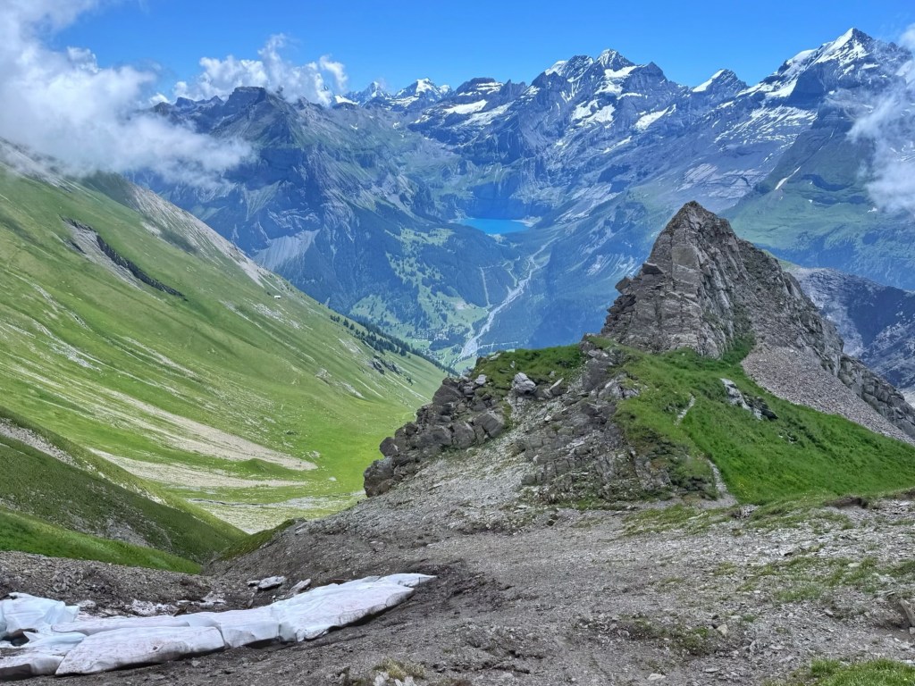 From the col, we turned right for the final ascent to Bunderspitz, reaching it after 2 hours 45 minutes, just as the sign at the bottom had predicted! There was some low cloud swirling around the mountain tops as we climbed, but it didn’t spoil the superb views… the snow capped peaks surrounding turquoise Oeschinensee, and other well known mountains including the Eiger, Monch and Jungfrau.