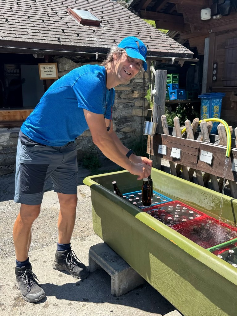 Finally, we dragged ourselves away from the summit and retraced our steps to Allmenalp. There we treated ourselves to a cold beer from their ‘fridge’, before taking the cable car back to the town. What a wonderful hike, perfect for our first step acclimatising to the heat and altitude.