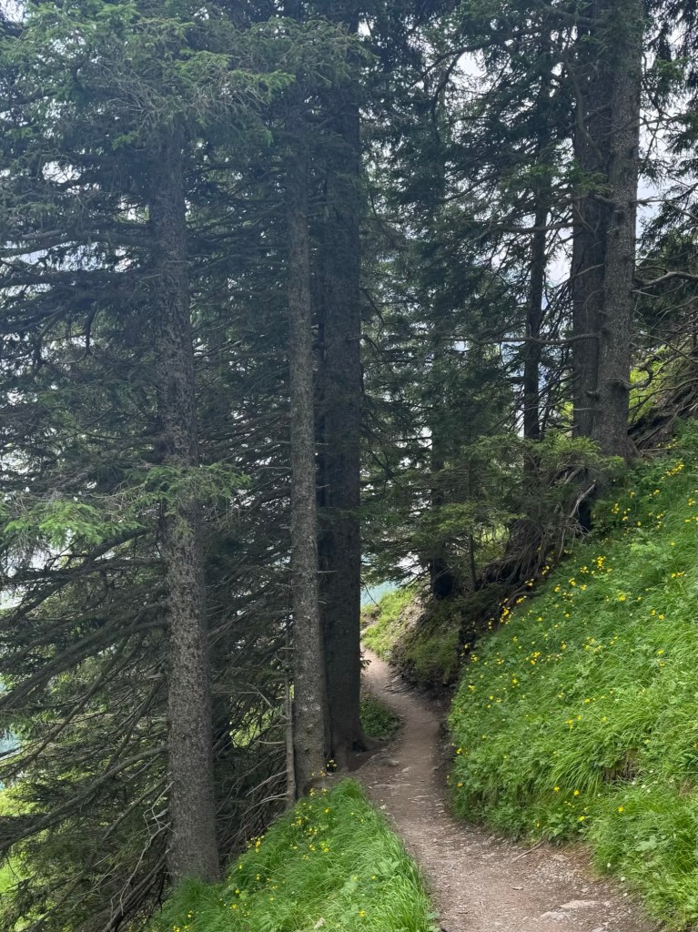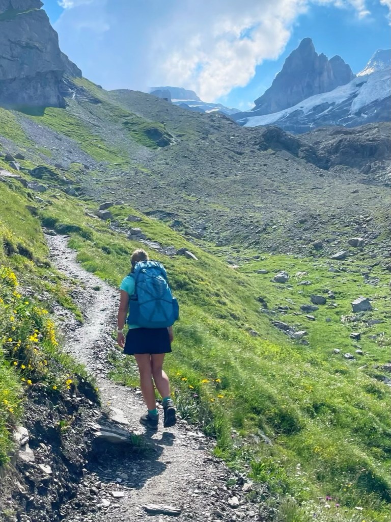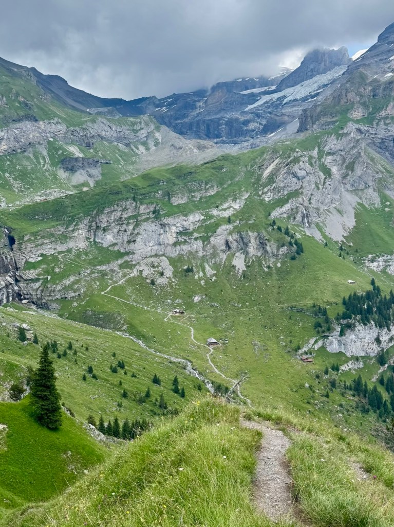 The balcony path was a joy to walk, meandering gently around the hillside above the lake, past waterfalls and through trees, with ever-changing but always beautiful views. We could even see all the way back to Hohtürli pass, with the hut now just a speck on the horizon.