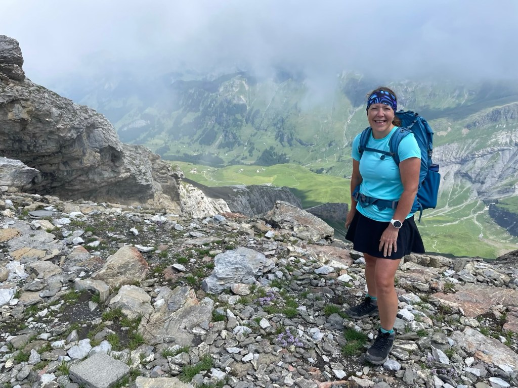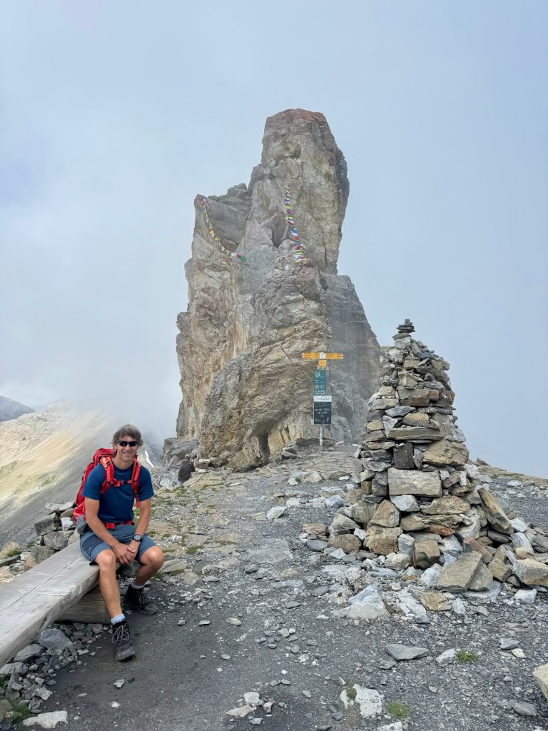 Finally, we popped out on to the col, breathing sighs of relief. No more climbing! Despite doubting myself, I’d made it to the top within 4 hours, well within the time suggested by the guidebooks, just as John had said I would! Low cloud was swirling around and at first there was nothing to see on the other side of the pass. Then it dissipated, revealing views down to the down to the Kiental Valley.