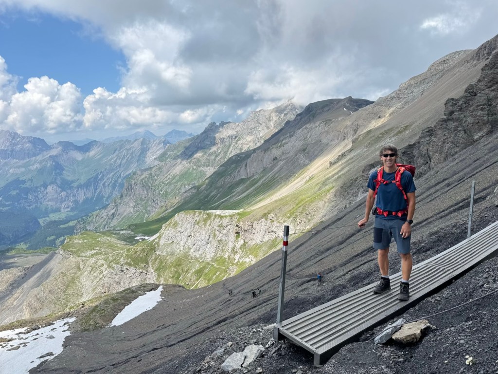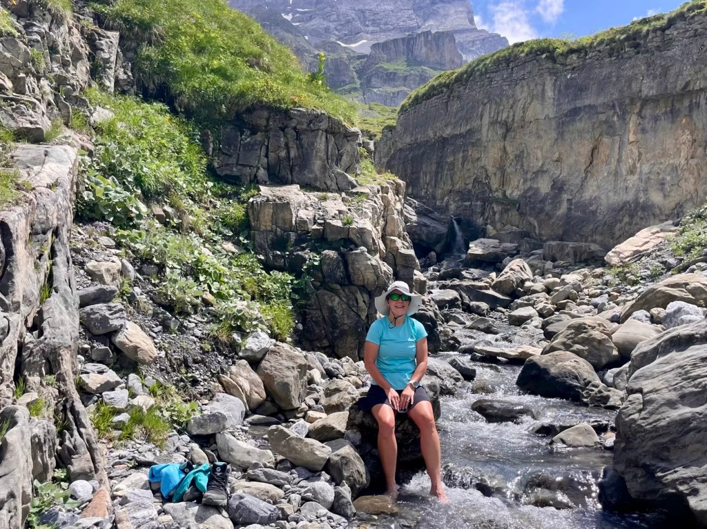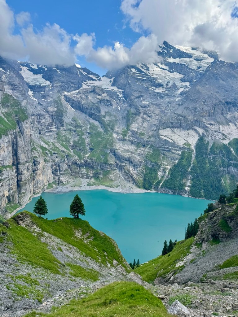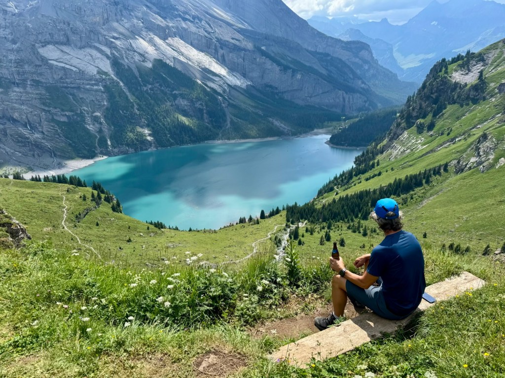 When we eventually arrived back at the stream above Ober Bergli, we took off our boots and socks off and dipped our feet in the wonderfully refreshing stream. We had plenty of time to get back to the lift station, so we decided to take a higher balcony path. But first, there was also time for a beer. We were very lucky because the cafe at Ober Bergli was just opening for the season, and we enjoyed our drinks sitting high on the cliffs above Öeschinensee. Beer stops don’t get any better than this!