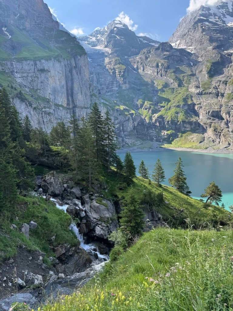 We took the cable car up to Öeschinensee (1680 metres) and followed a higher path above the lake than we took yesterday, enjoying the views of the waterfalls tumbling down the steep cliffs into the turquoise lake below. Then, zigzagging up the hillside through pastures, we passed the cafe at Underbärgli (1767 metres), before reaching Oberbärgli (1973 metres) perched high above the lake, before stopping for a snack by a stream.