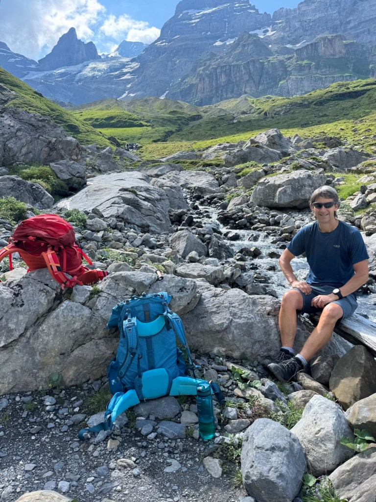 We decided against going to the Blümlisalp hut a short hike above us because we had our own food, and thought we still had too much difficult hiking to do to have a beer. We ate our lunch enjoying fabulous views of the peaks and glaciers making up the Blüemlisalp massif, and back towards Kandersteg and Bunderspitz, which we climbed earlier in the week.