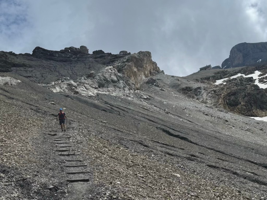 A series of nasty switchbacks ended at the crest of a glacial moraine, which provided a short reprieve from the endless climbing. Finally, we could see the Hohtürli pass and the Blüemlisalp Hut, on the horizon, still a long way away. Would I make it? I decided I’d keep going until 13.00 then, even if we hadn’t made it, we’d turn back. The last lift back down to Kandersteg is at 18.00 and I definitely didn’t want to miss that and walk even further!