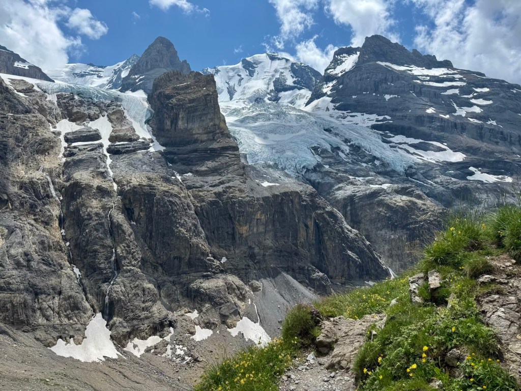 The path became narrower and rougher now, and the climb already felt relentless in the heat. The scenery was beautiful though… the rocky meadows, the banks of flowers bordering the path, and the retreating glaciers above us.