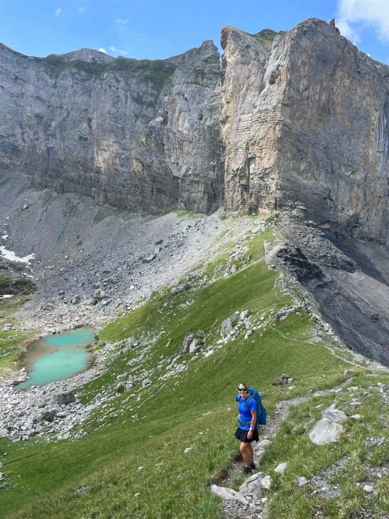 Now it was time to return to the valley, crossing a narrow ridge called Schwarzgrätli, then passing a small turquoise lake below the huge rocky massif of Felshore (2784 metres).