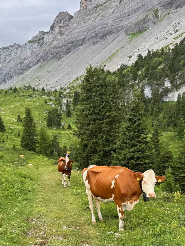 We caught the bus to Eggeschwand and took the cable car to Sünnbuel (1927 metres) where our hike started. The cows were the first obstacle. I know it’s their meadow, but do they really have to stand on the path?! Then the trail went downhill instead of uphill, making the summit further away!