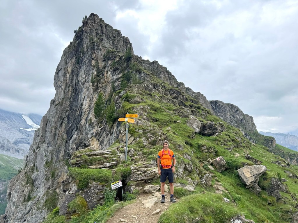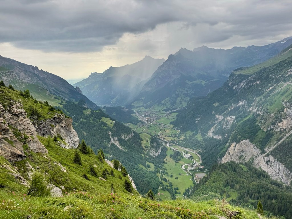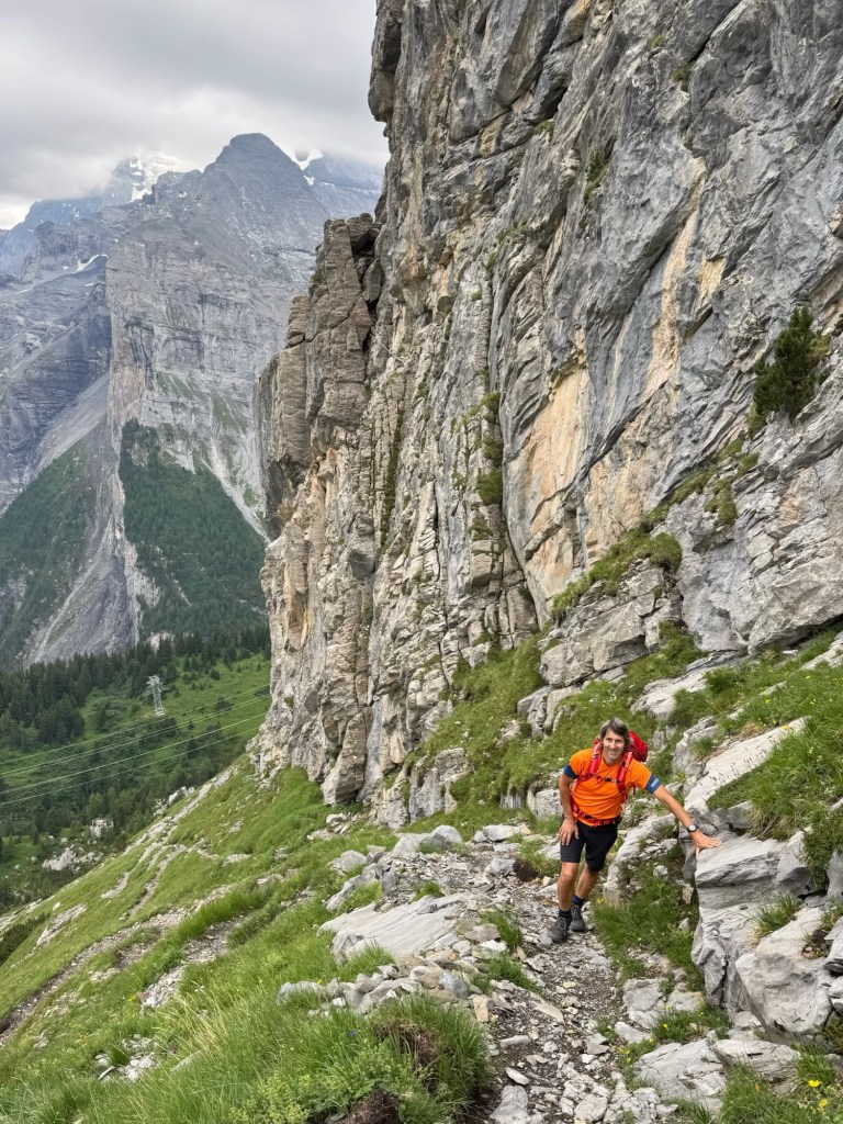 The climb soon began in earnest, on a narrow rocky path winding steeply up around the rock face of the mountain of Gällihore. After a serious of zigzags we finally reached a flat area where we could enjoy the views, watching rain falling over Kandersteg, and hoping it didn’t come our way.