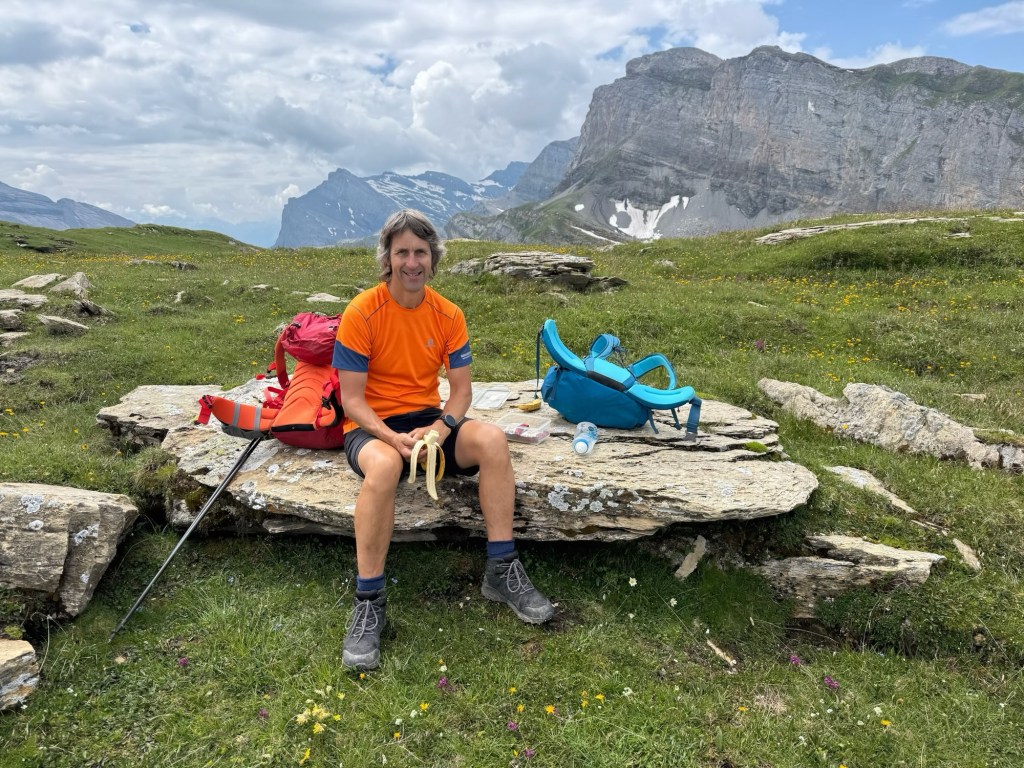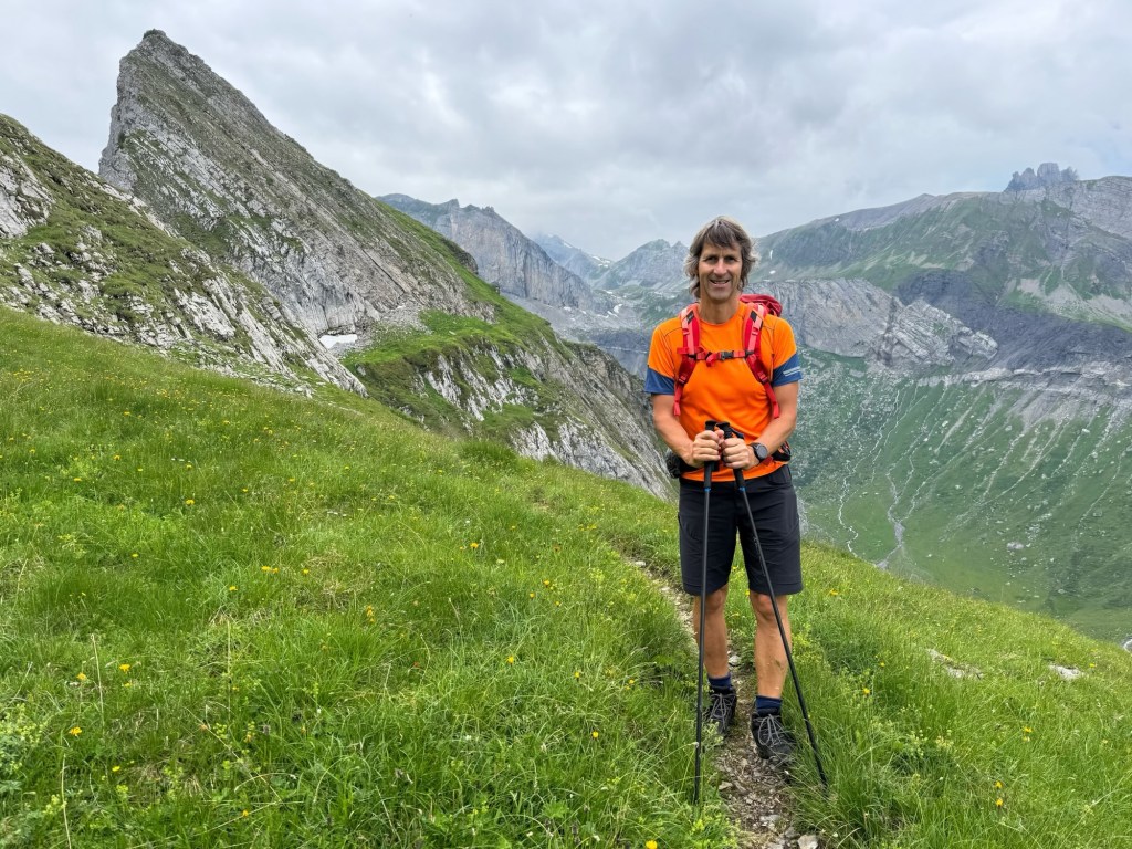 We then retraced our steps back down the steepest section and joined a path along Üschenegrat, running below the ridge for about 2 kilometres, sometimes challenging and rocky, and sometimes easy through beautiful flower meadows.