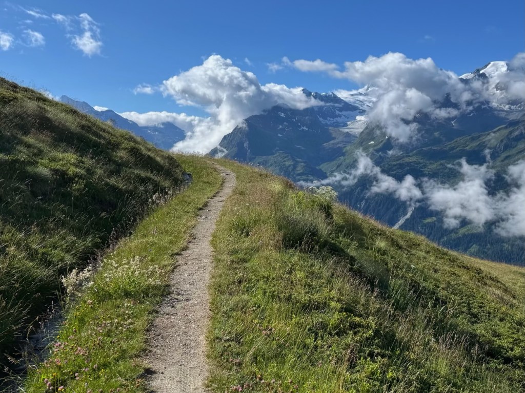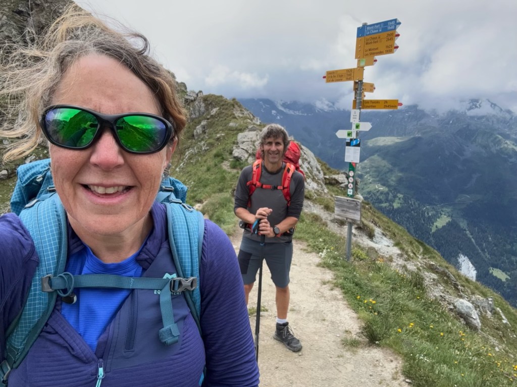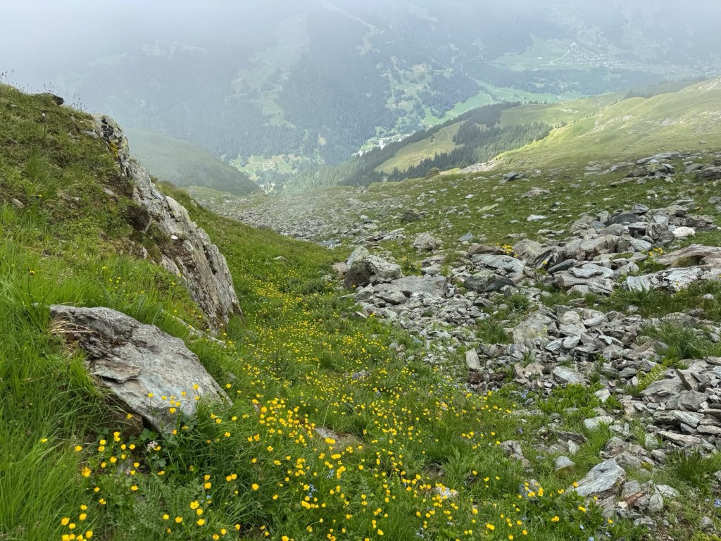 At this point, the cloud cleared and we could see all the way back down the valley to Le Chable where we started this morning but, ahead of us, the Mont Blanc massive was still shrouded in cloud.