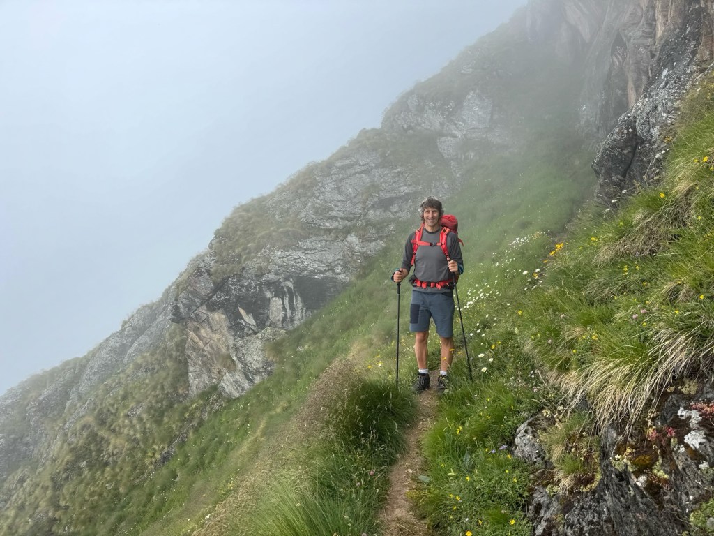 The trail was quite steep in places, so we were breathing heavily, and were glad to turn the corner at the at the end of the mountain into a different valley. From here the gradient was a little less. There were now different views below us or there would’ve been if they weren’t hidden by the cloud! I quite liked the eerie feeling of the cloud swirling around us.