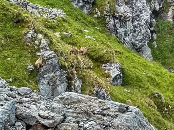 As we were crossing a boulder field John spotted a chamois on a rock. As we stood watching it, 5 or 6 more appeared including young ones. They gradually made their way down the hillside where they felt safer. We were delighted to see them.