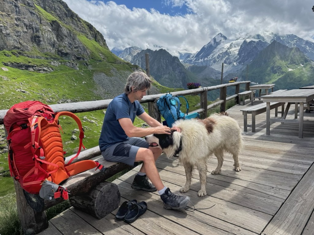 As we explored some traditional Swiss huts at the end of the lake, a huge dog appeared without a human. It scared me for a while, but turned out to be friendly. We thought it must be from Cabanne de Louvie but, once we got there we discovered it wasn’t… it appears to be lost 😢