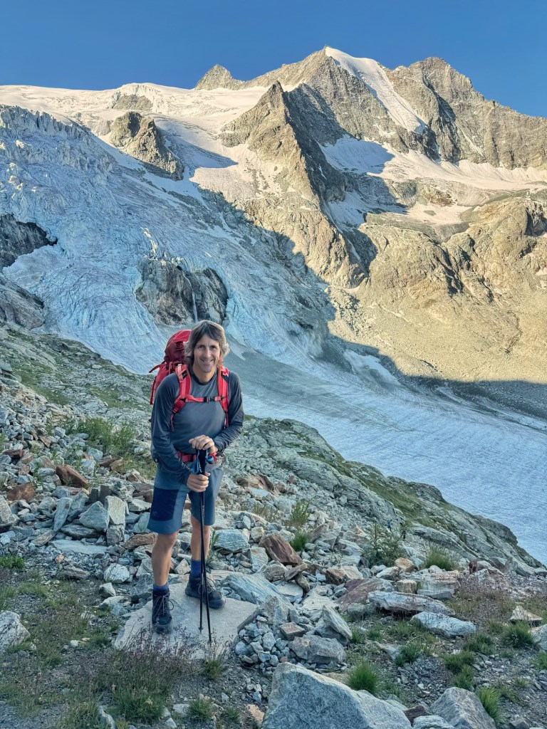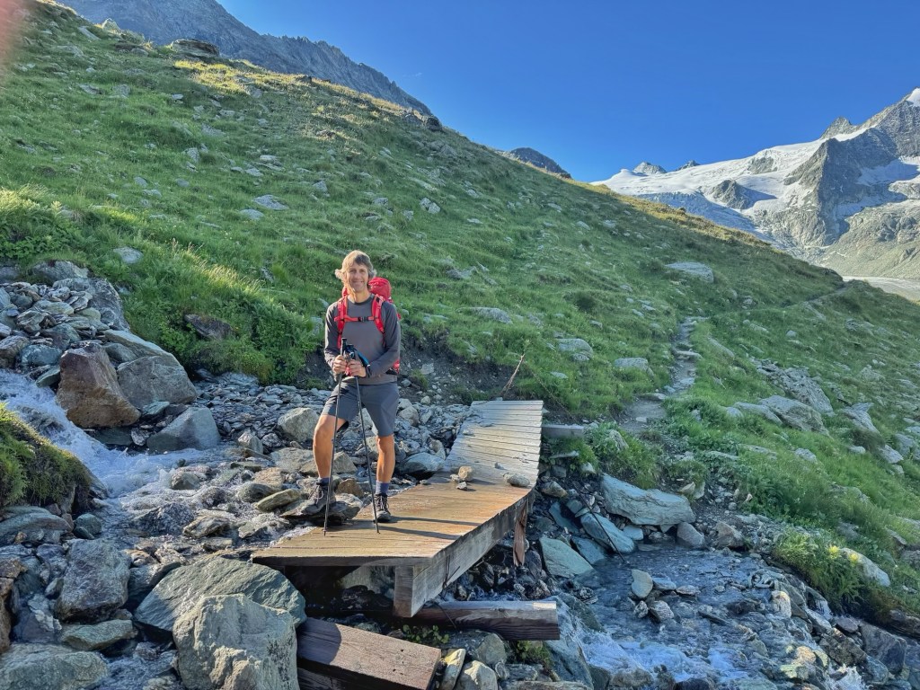 The slog uphill, backwards and forwards on the relentless switchbacks seemed to take forever. I was jealous of all the people coming downhill in the other direction, and of anyone with a small rucksack! We just kept ticking off the metres and eventually we popped out on the Col. John left me recovering in the sunshine, enjoying the view of the Weisshorn (4506 metres), while he ran up to tick off a nearby peak, Corne de Sorebois. Then we set off down hill to the cable car station through a grassy basin full of ski infrastructure.