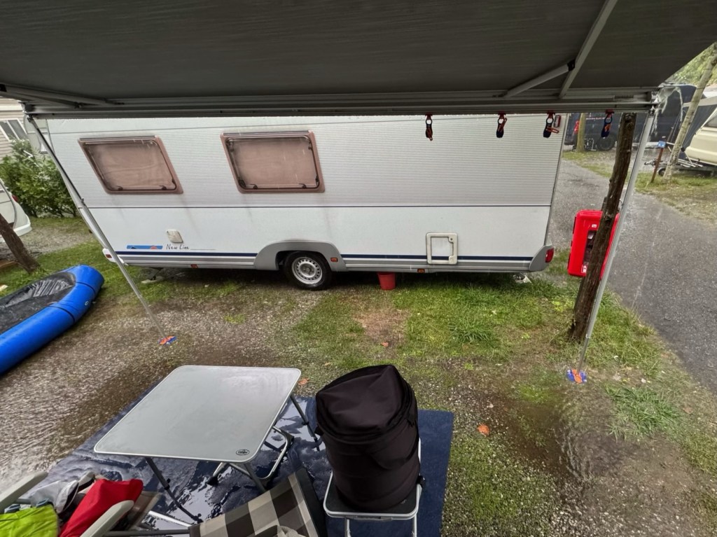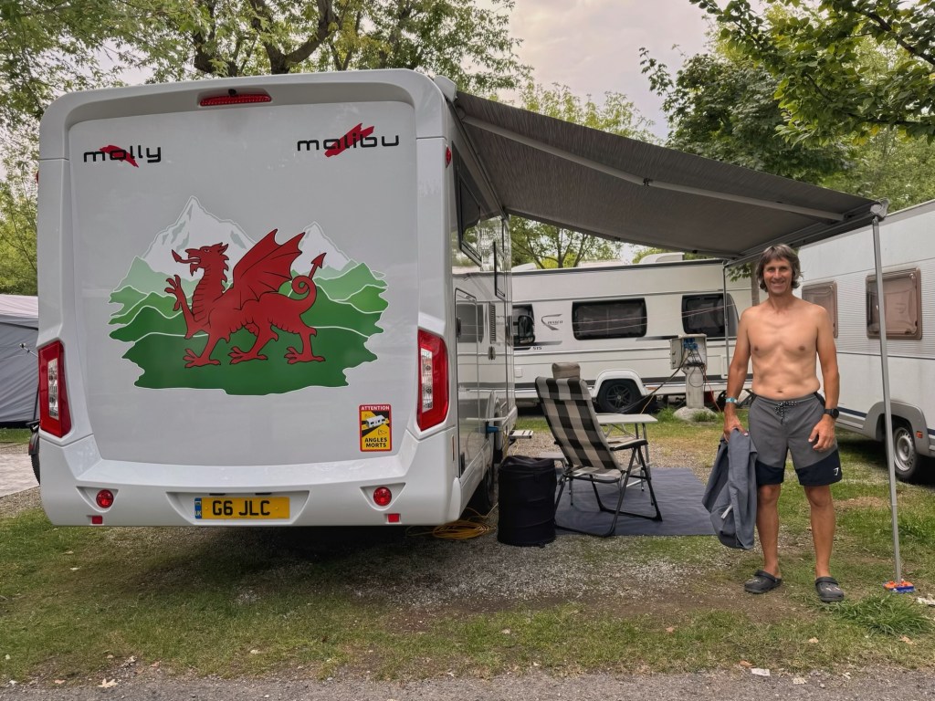 At 3 o’clock in the morning, we were woken by torrential rain and quickly closed the roof vents. John checked that everything outside the van was sheltered and dry under the awning, while I made a cup of tea. Finally, the rain subsided and the distant thunder and lightning stopped, and we went back to sleep.