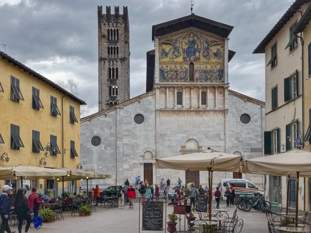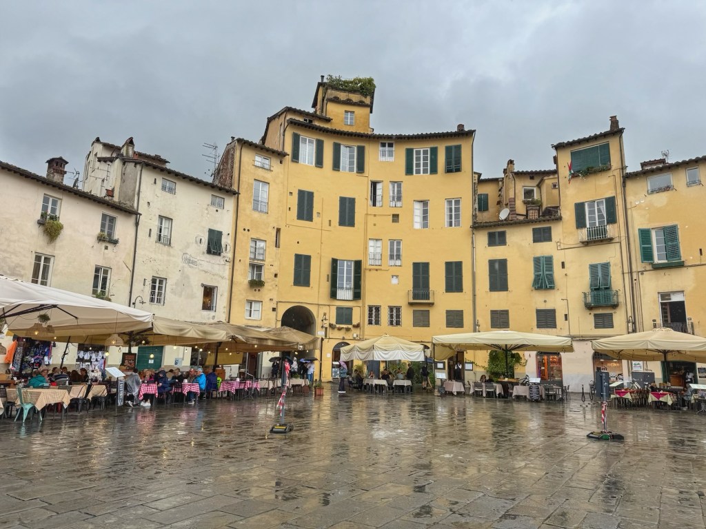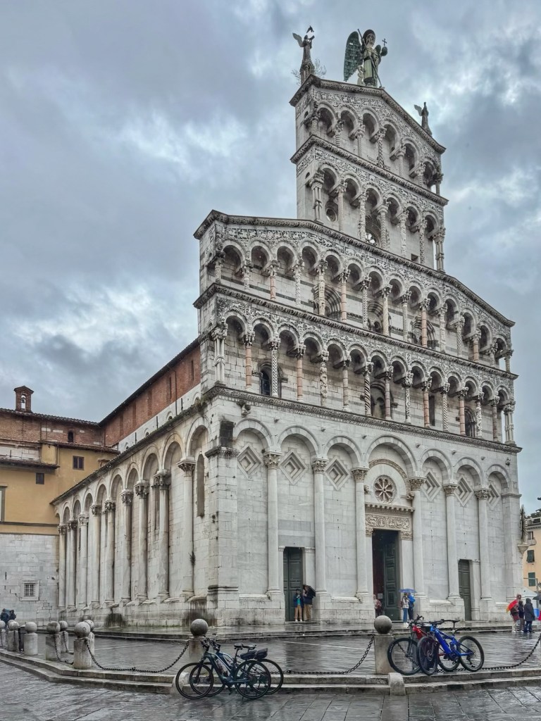 Unfortunately, it is still raining today. Nevertheless, we grabbed our umbrellas and wandered into Lucca. We meandered through the narrow streets and piazzas, first visiting the church of San Michele in Foro, topped by a huge winged figure of an archangel slaying a dragon.