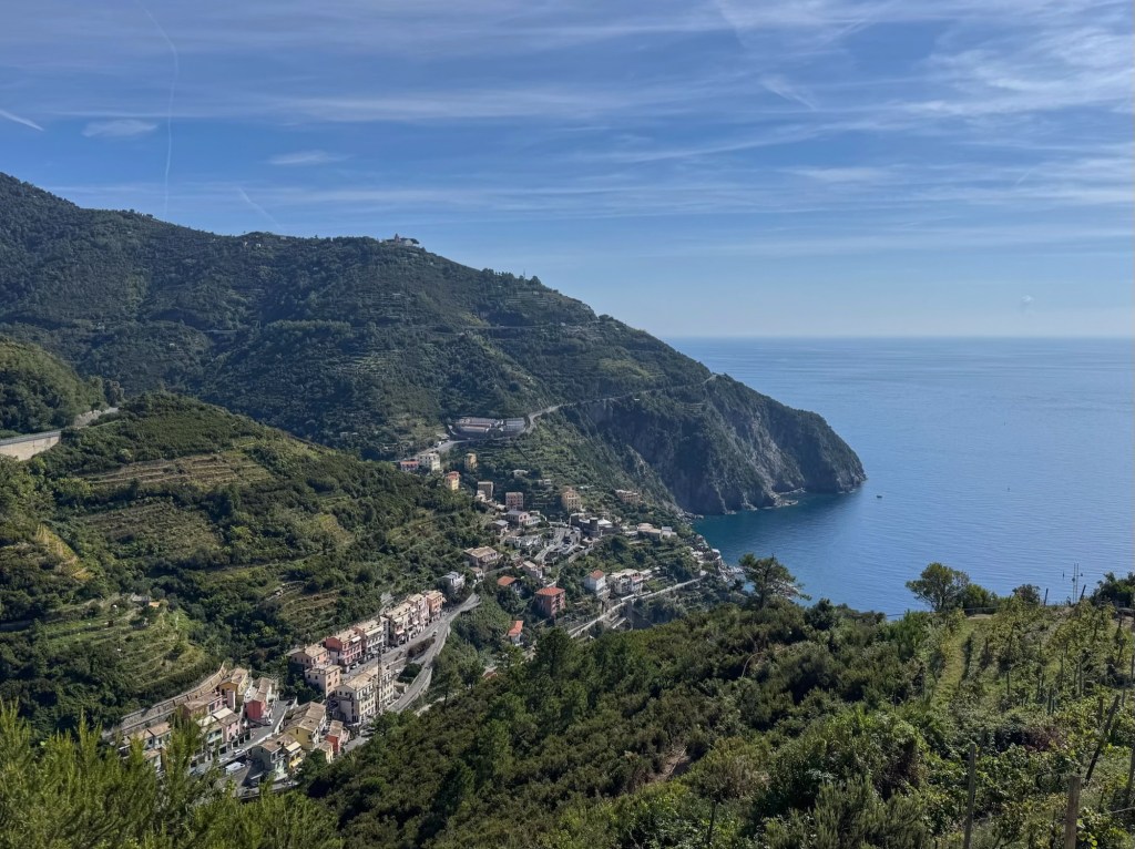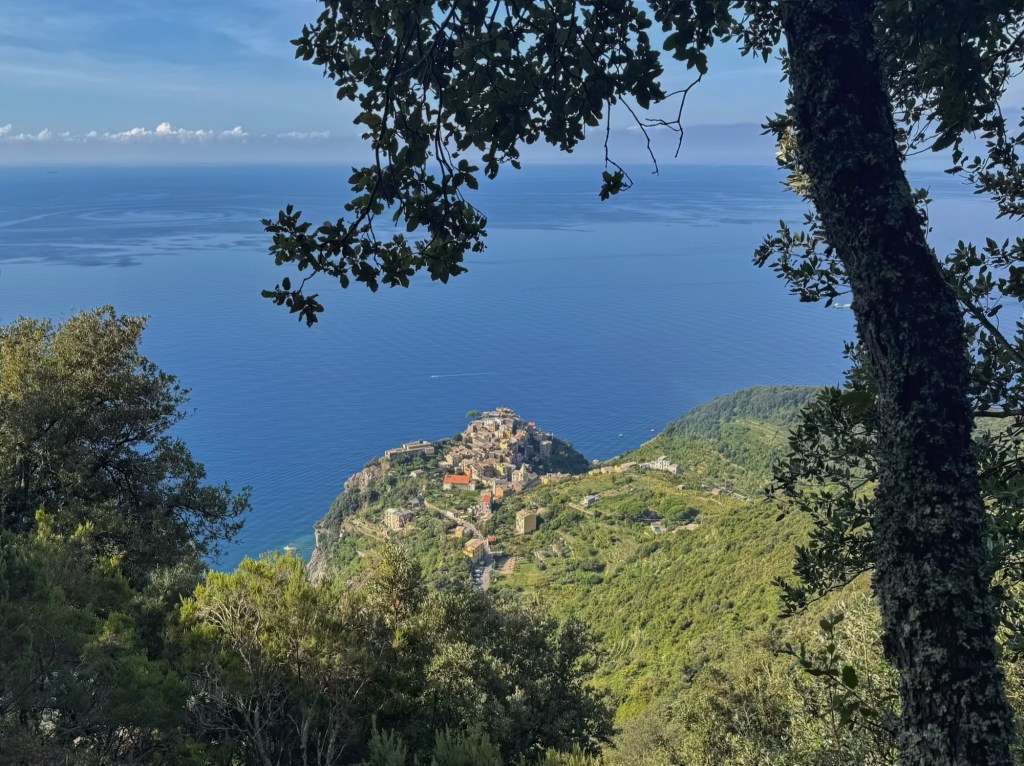 At the top, the path was level for quite a while, which made a welcome change. We traversed the hillside through trees then terraced vineyards, with wonderful views back to Corniglia and ahead to the next town, Manarola.