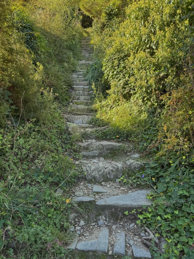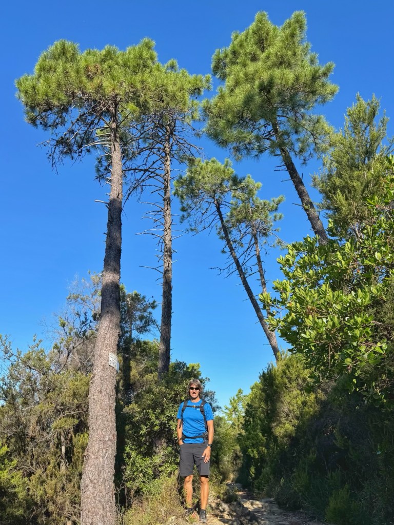 From the viewpoint we began our descent to Sestri Levante through Mediterranean vegetation… olive, oak and strawberry trees and tall, stately maritime pines.
