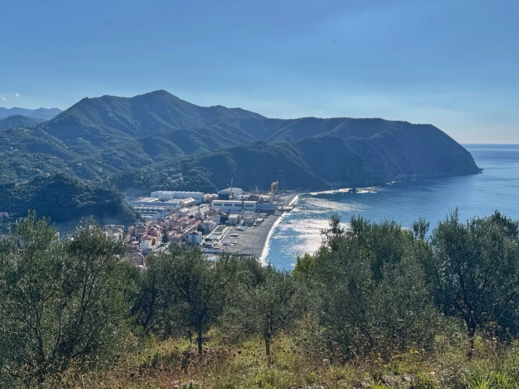 Riva Trigoso used to be a fishing village but it’s now home to a huge shipyard, sitting alongside the promenade and sandy beach. The campsite shuttle bus dropped us at the station and, having walked along the prom, we climbed the wooded headland on a rough path.