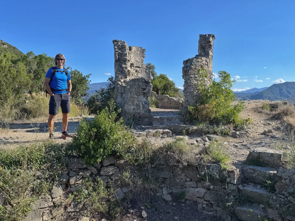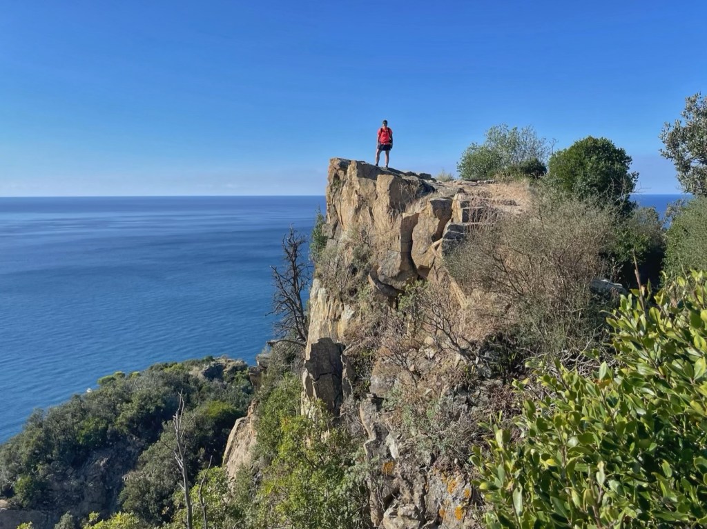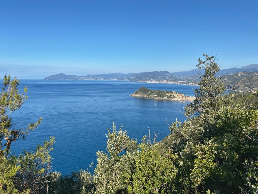 About 40 minutes later, we reached Punta Manara, an ancient watchtower, a little disappointed to find it in ruins. The views from here were amazing though, back to Riva Trigoso and ahead to Sestri Levante. Further along the coast, we could see the Portofino headland, which we’ll be visiting next week.