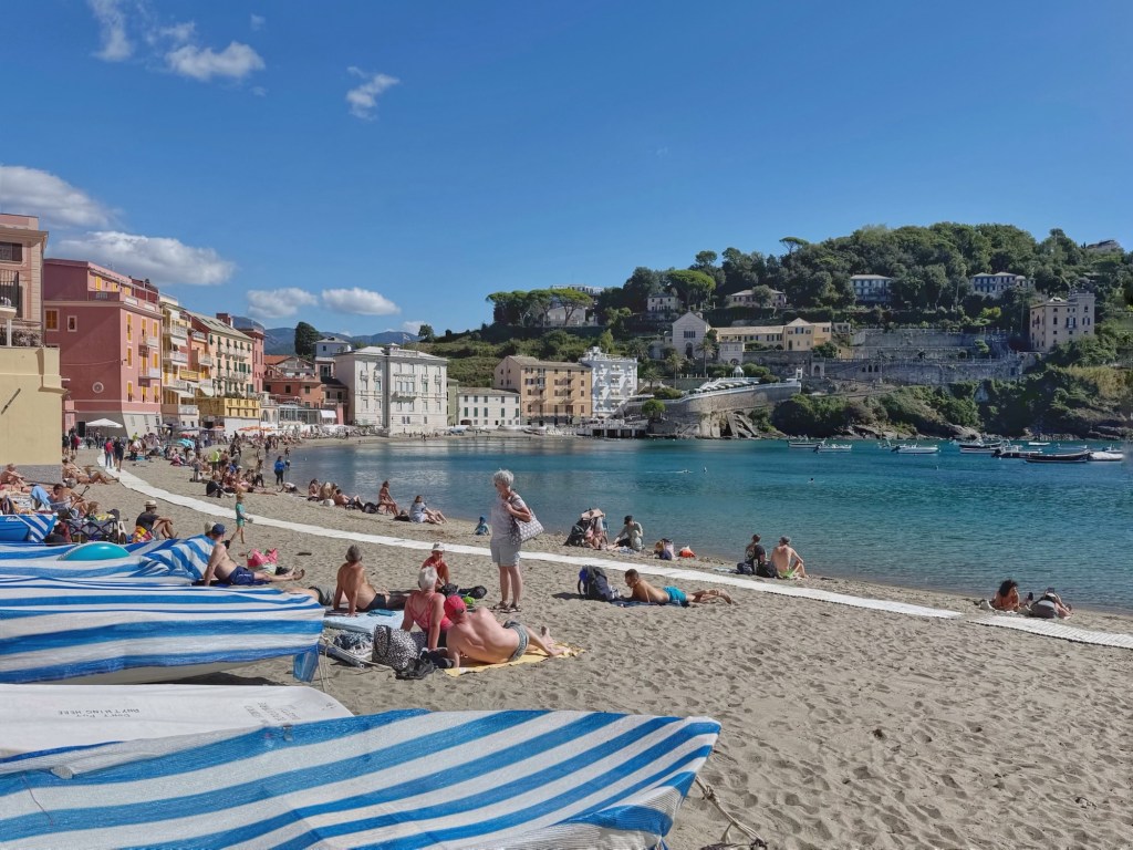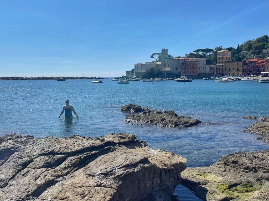 After lunch, we went to the smaller beach, the Baia del Silenzo, once again choosing to sit on the rocks rather than the sand, away from everyone else. It’s a very pretty beach, surrounded by multicoloured buildings and dotted with fishing boats.