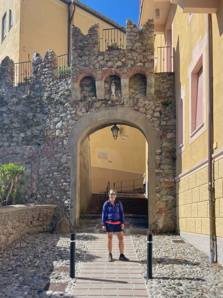 We spent a little time looking for a couple of geocaches, but didn’t find either, giving up when we both ended up scratched by the spiky plants! The descent continued through cultivated land, then gardens of beautiful villas, until we reached the narrow streets of the town.