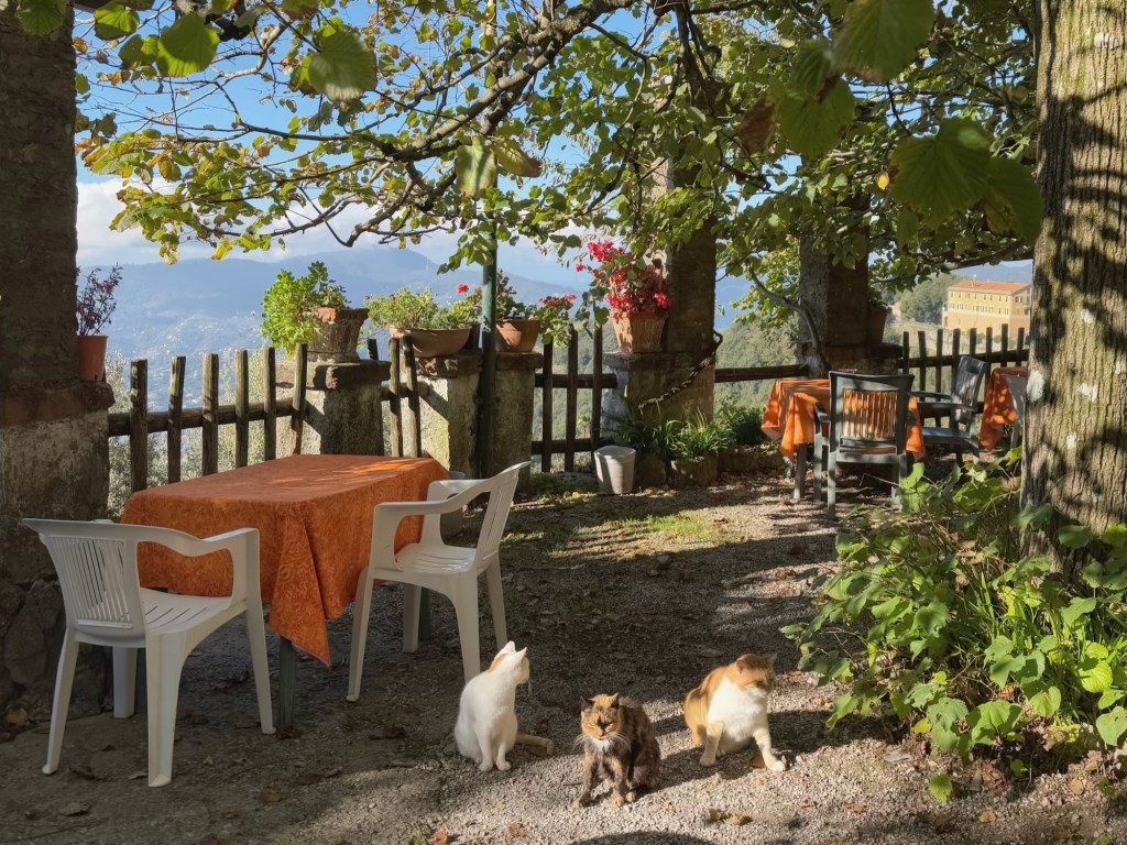 We passed a small restaurant perched on the mountainside, with lots of cats roaming around but, sadly, it was too soon to stop for a break. We continued on through the forest until we found a viewpoint to stop and eat our croissants.