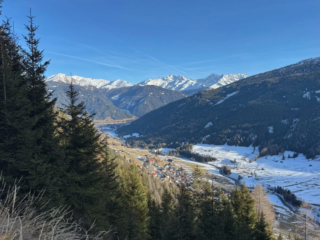 We had a much needed good sleep and a lie in with a cup of tea. Then, once washed and dressed, we wandered down to the supermarket to do a little shopping for food for breakfasts and lunches for the week. Eventually, after a late breakfast, we walked back down to town to catch the free bus to Trins, a small town in a neighbouring valley.