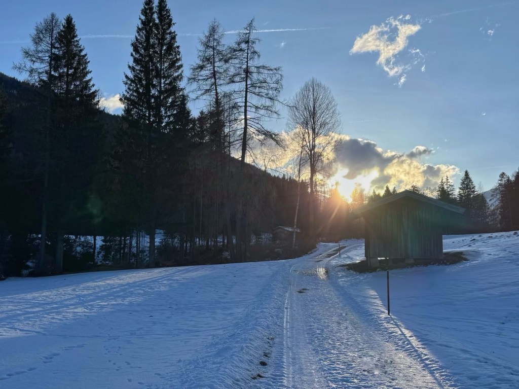 Once back in town, we found it was half an hour until the next bus back to Steinach. As the bar wasn’t open, rather than waiting we decided to walk back along a lane beside the river. It was very pretty, lit by the setting sun, and the babbling water beside us sounded delightful.