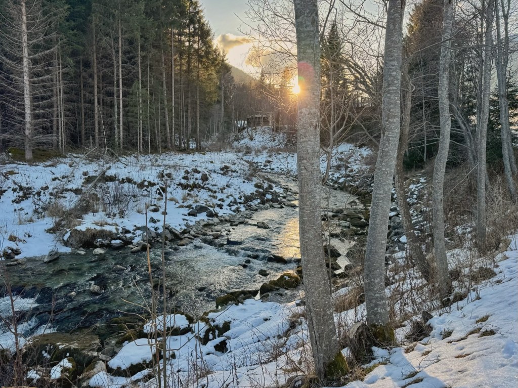 Although we’re disappointed that there isn’t more snow, it’s lovely to have sunshine and the walk was pretty. Hopefully, there’s more snow in the valley where we’ll be snowshoeing, or more will fall before the weekend. Fingers crossed! Anyway… I enjoyed taking pictures of the waterfall, guarded by two metal dragons, and I got some good shots of the views of the valley and the snowy jagged mountains in the distance.