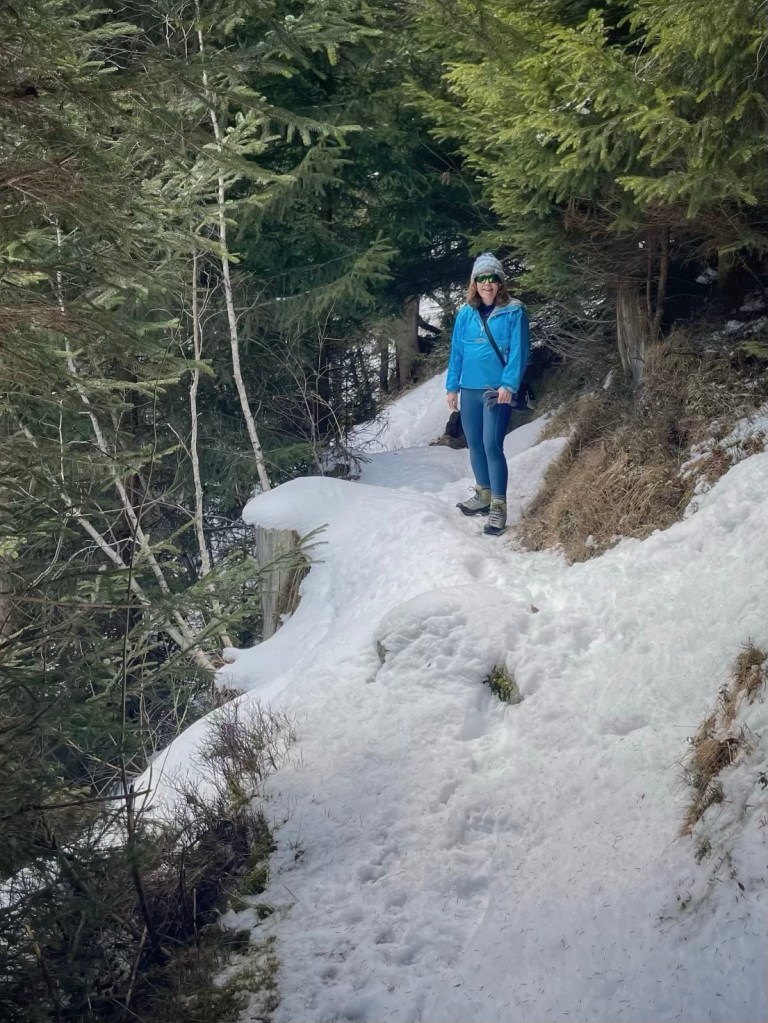 After trying and failing to cross the gully higher up, we gave up and turned back towards Gschnitz. The snow wasnāt deep enough to need snowshoes, but we put our spikes on our boots for the downhill return. Some areas were quite icy and slippery, especially in the shade of trees or where the snow had melted in the sunshine then refrozen.