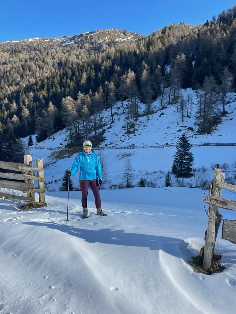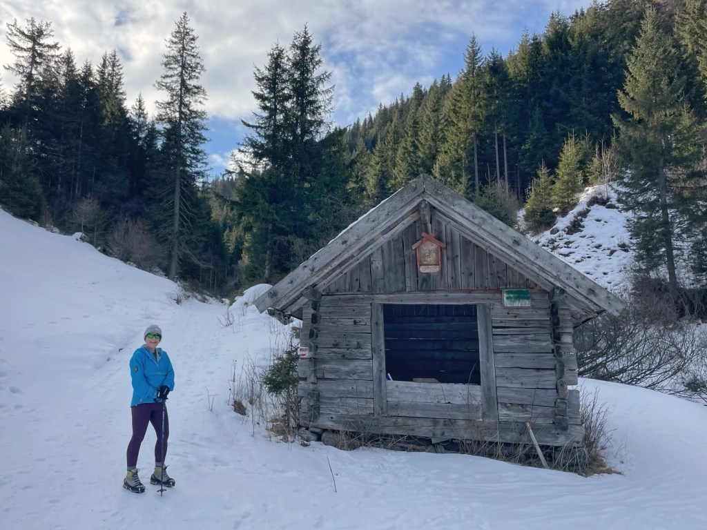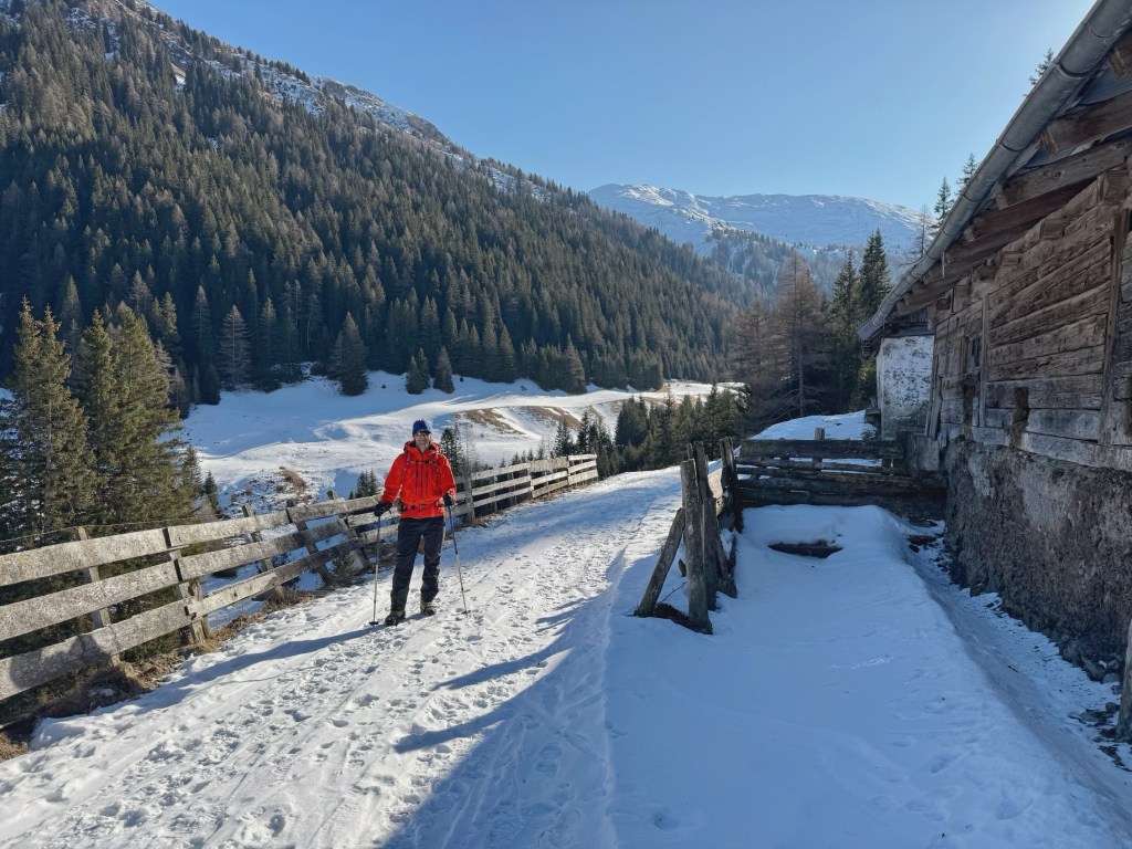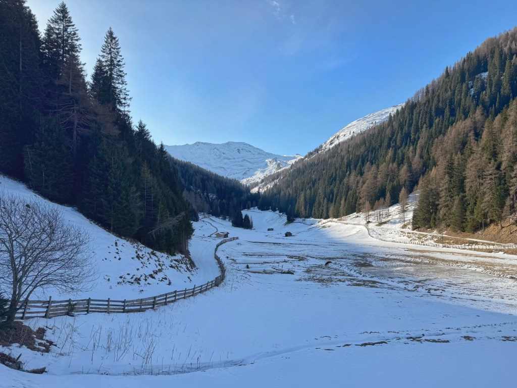 After about an hour, the valley opened out to lovely views of snow covered mountains, and it wasn’t long until we reached Frader Alm. Apart from a couple of skiers at the start of the walk, we didn’t see any one else all morning. It was very peaceful having the hills to ourselves.