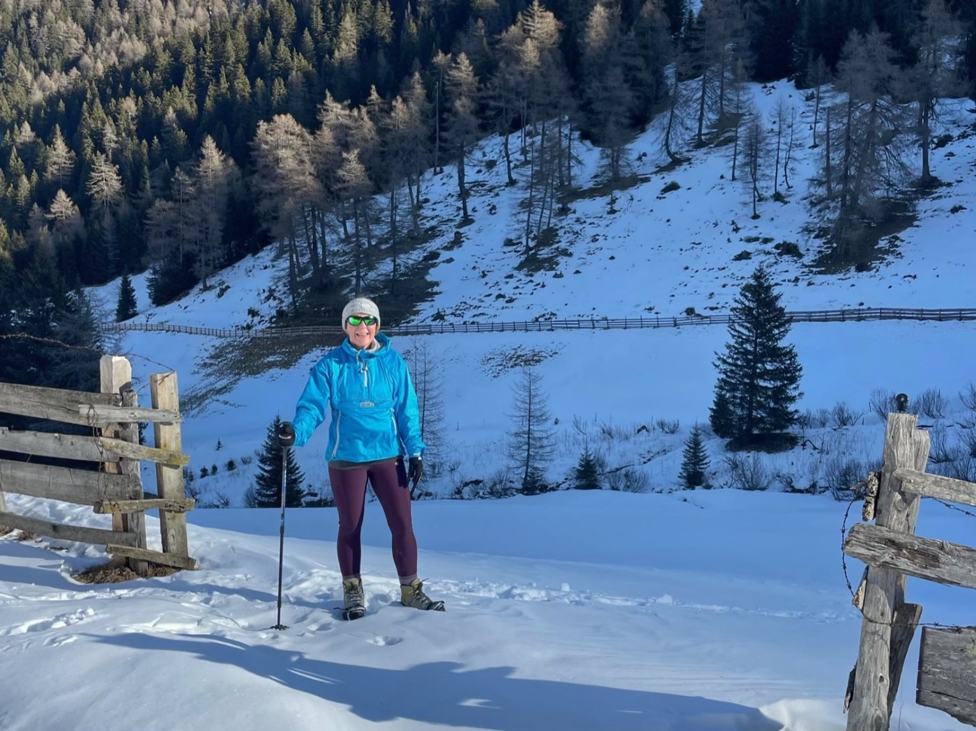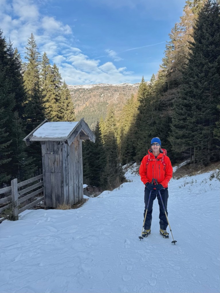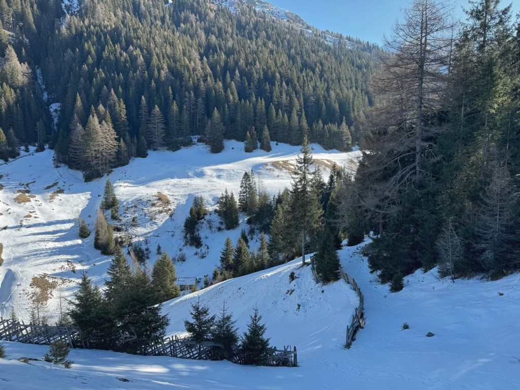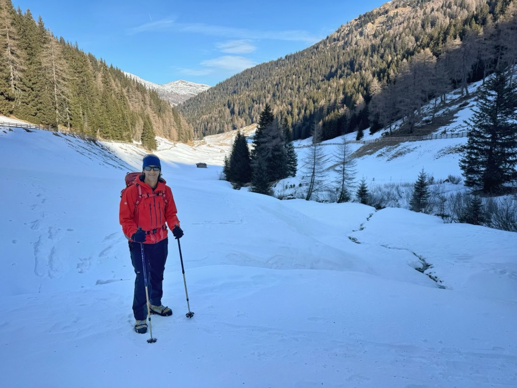 After about an hour, the valley opened out to lovely views of snow covered mountains, and it wasn’t long until we reached Frader Alm. Apart from a couple of skiers at the start of the walk, we didn’t see any one else all morning. It was very peaceful having the hills to ourselves.