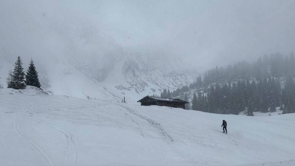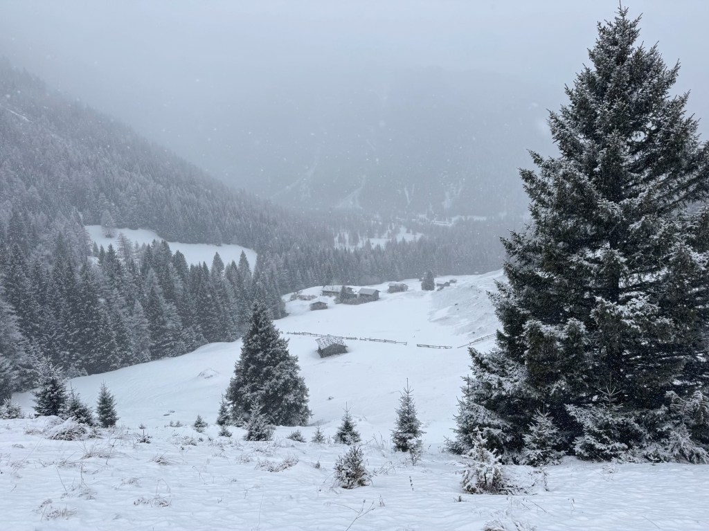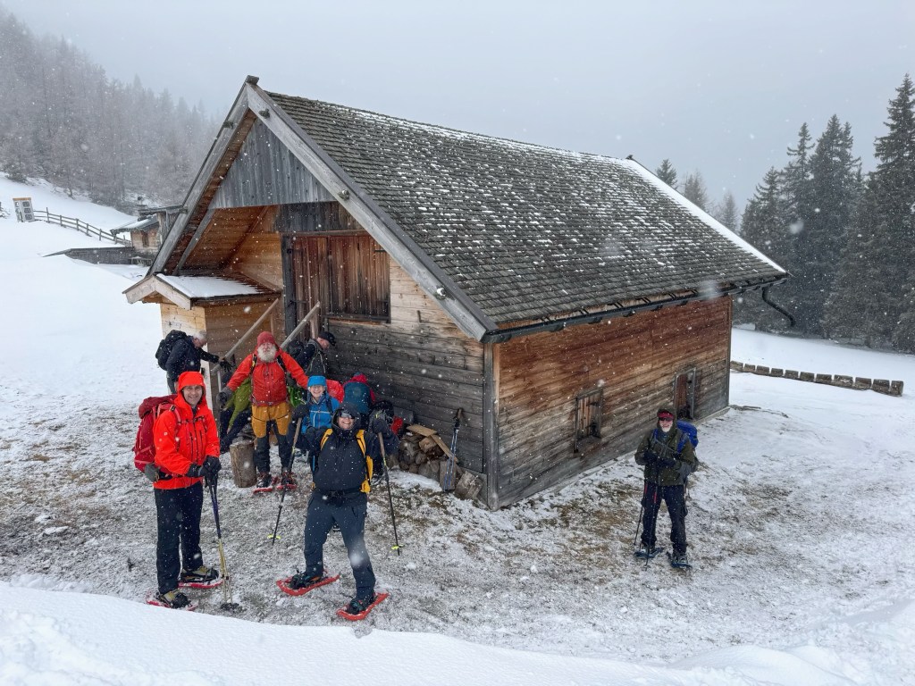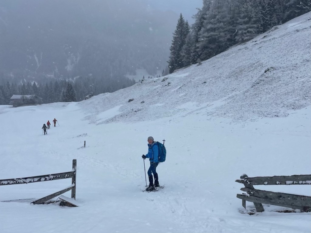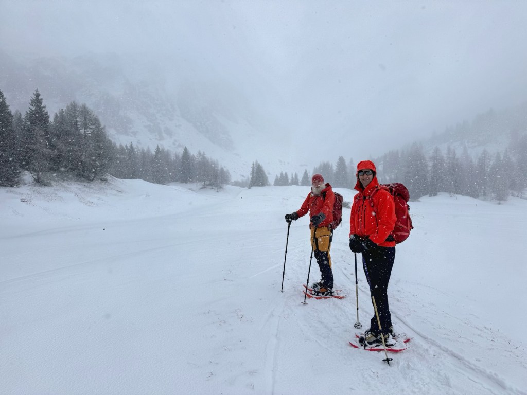 By now, it was snowing more heavily and the meadows were very atmospheric, with the mountains shrouded in cloud. We trudged through deeper snow, enjoying the need for our snowshoes, and following the tracks made by Sean’s group.