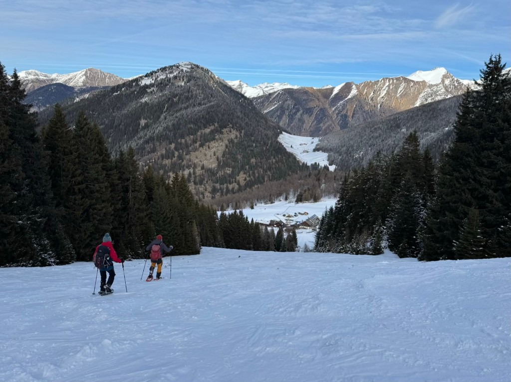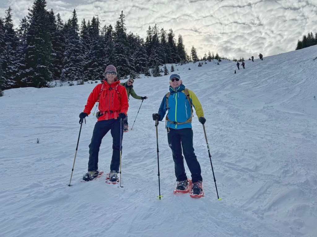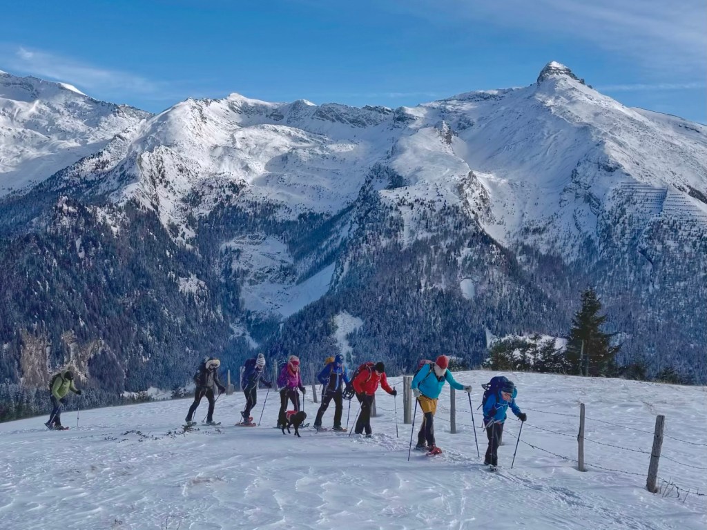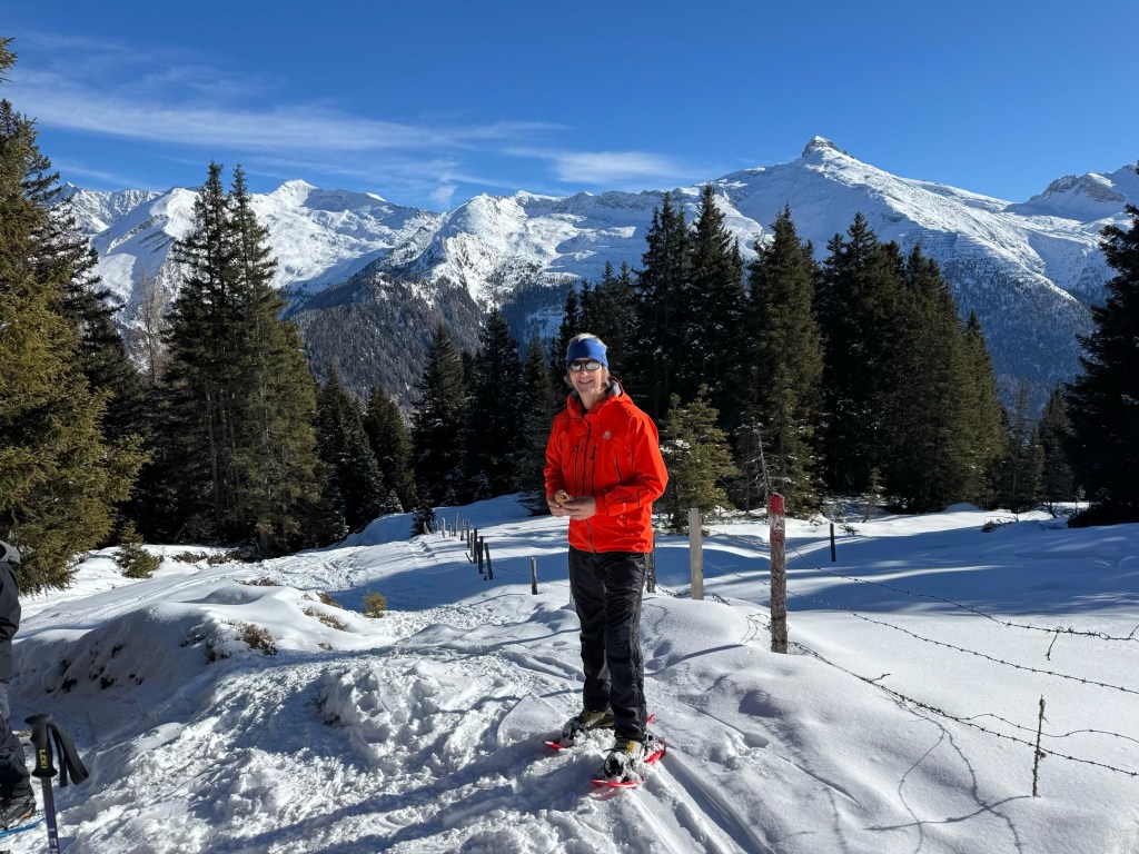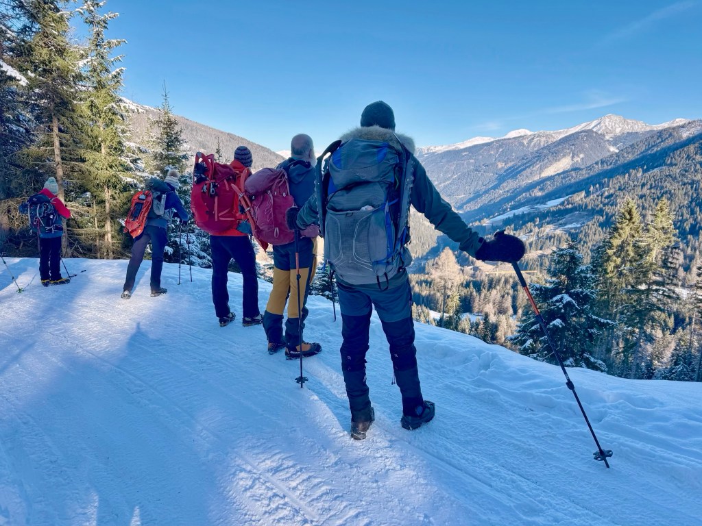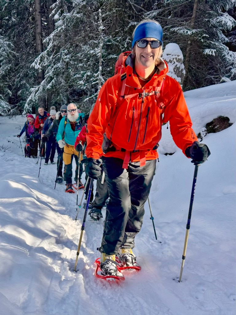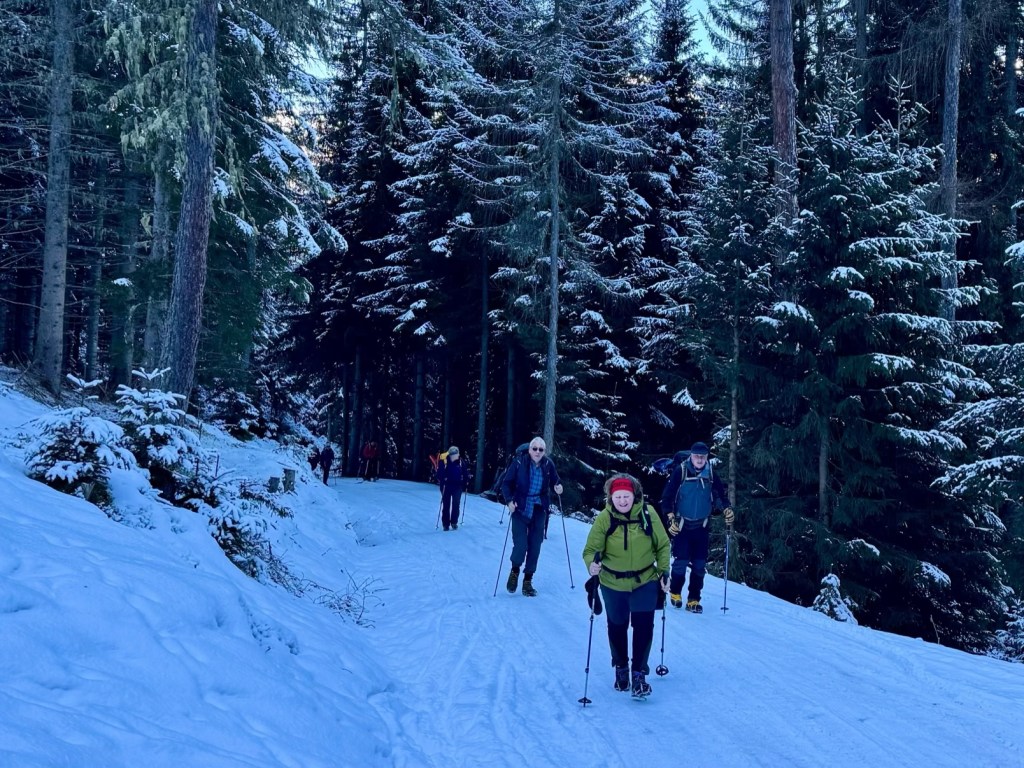 After drinking hot chocolate sitting in the sunshine, we set off again to climb another 480 metres to the peak (2115 metres). The snow was deeper now so our group changed into snowshoes. We climbed quite steeply on a narrow footpath through forest, occasionally being overtaken by ski tourers.