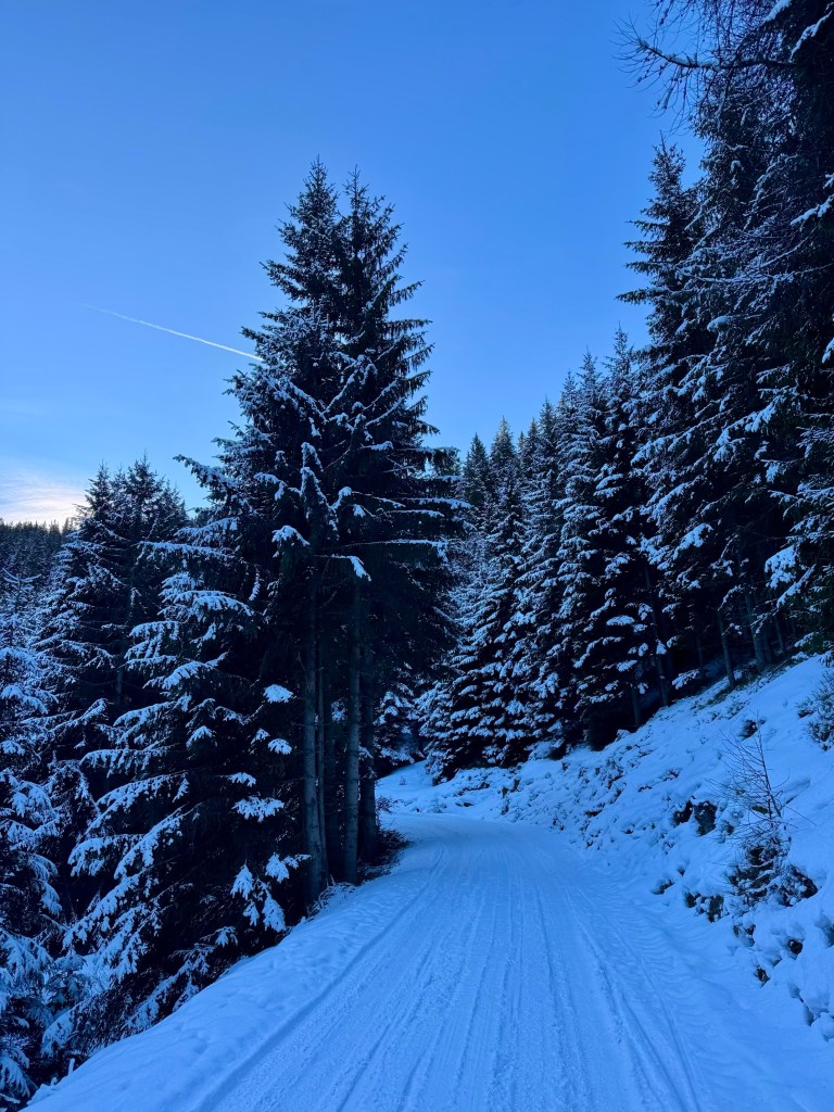 We didn’t have long to wait for Minx and the others. Then we set off uphill in our spikes, first on road, then on a forest track through the shady forest, with occasional glimpses of beautiful mountain landscapes. It’s been another lovely day, with blue sky, sunshine and crisp, glistening white snow.