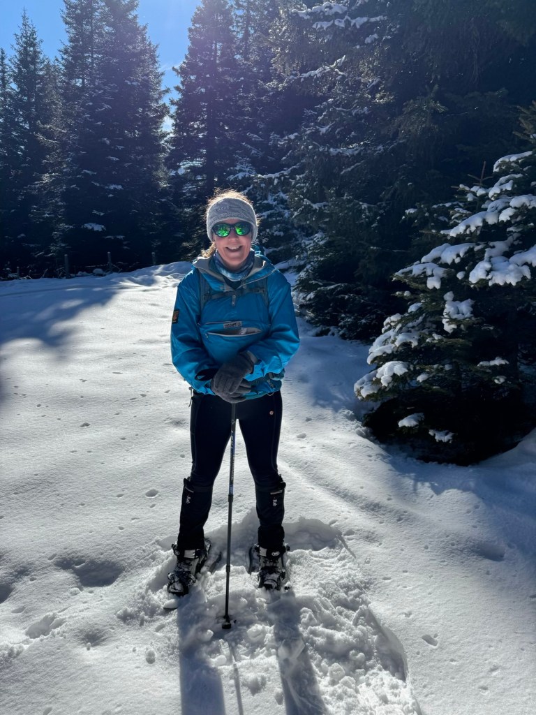 I’m pretty sure this was the most enjoyable snowshoeing day that I’ve had… just enough of a challenge, good company, a peak, wonderful weather, stunning views, good snow, sunshine and blue sky. The only thing I didn’t like was the exfoliating wind on the summit, which left my face sore and glowing! Oh… I also didn’t like finding out that I’d been walking all day with yesterday’s knickers down the back of my leggings 😜.