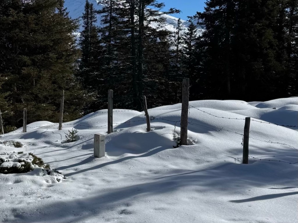 After a while, the trees opened out a little and we followed a barbed wire fence and occasional concrete markers along the Austrian-Italian border. I was dying to climb the fence into the virgin snow in Italy, but didn’t want to risk getting tangled up and injured, wearing awkward snowshoes!